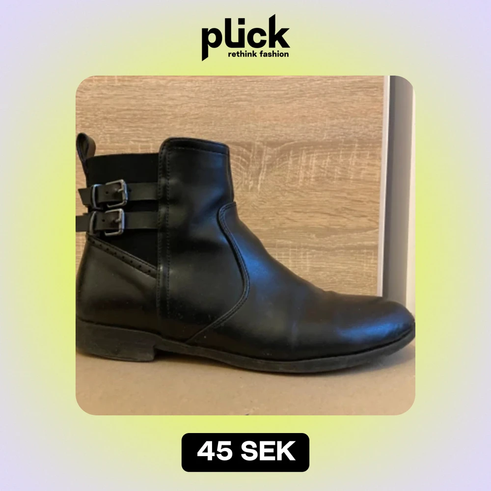Säljer ett par snygga svarta stövletter i skinn. De har två dekorativa spännen på sidan och en praktisk dragkedja för enkel på- och avtagning. Perfekta för både vardag och fest!