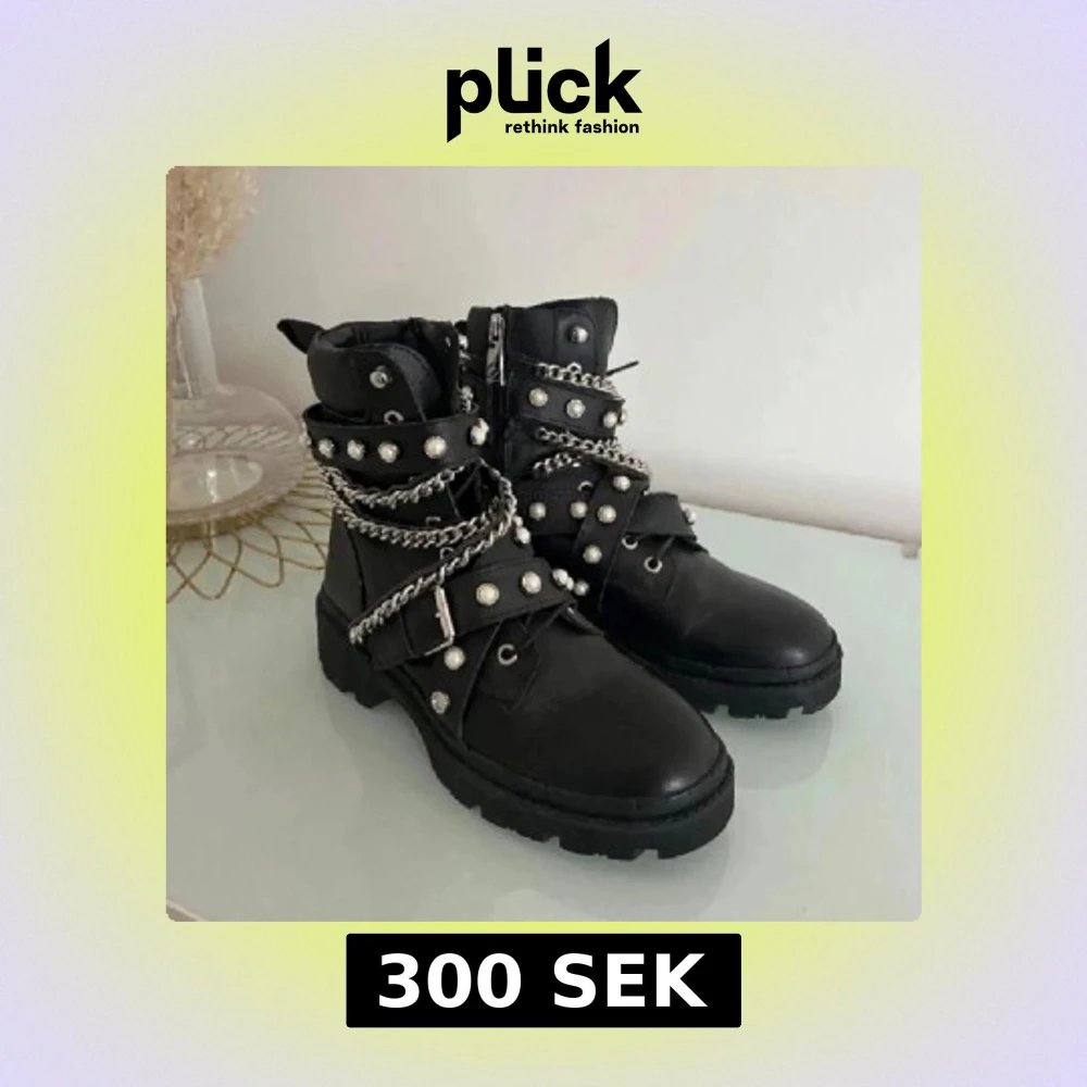 Säljer ett par svarta boots från Zara med coola silverfärgade kedjor och pärlor. Mycket bra skick då de knappt är använda, kan sänka pris vid snabb affär!!
