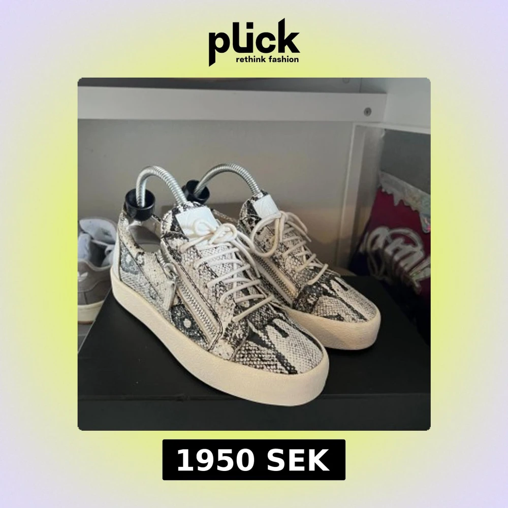 Säljer ett par sjukt snygga sneakers från Giuseppe Zanotti med ormskinnsmönster i svart och vitt. Skorna har snörning, dragkedjor på sidorna och en platt vit sula. Ovanlig modell samt i bra skick!