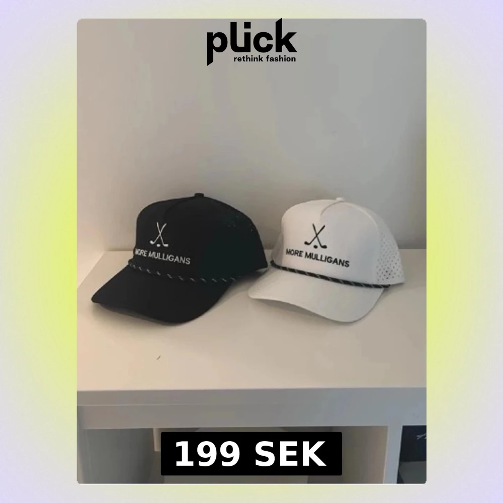 Två kepsar från More Mulligans, en svart och en vit. Båda har broderad logga med två korsade golfklubbor och texten 'MORE MULLIGANS' framtill. Kepsarna har böjd skärm och ventilerande mesh på sidorna. Perfekt accessoar för golf eller streetwear.