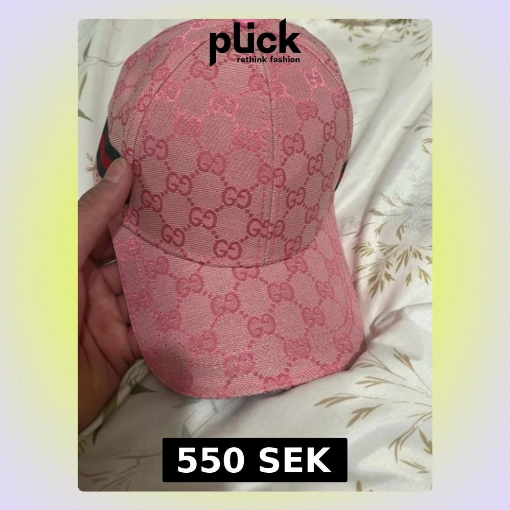 Snygg rosa keps från Gucci med klassiskt GG-monogram över hela kepsen. Kepsen har böjd skärm, knapp på toppen och detaljer i grönt och rött på sidan. Tillverkad i canvasmaterial med exklusiv känsla. Perfekt för dig som vill sticka ut med en trendig accessoar.