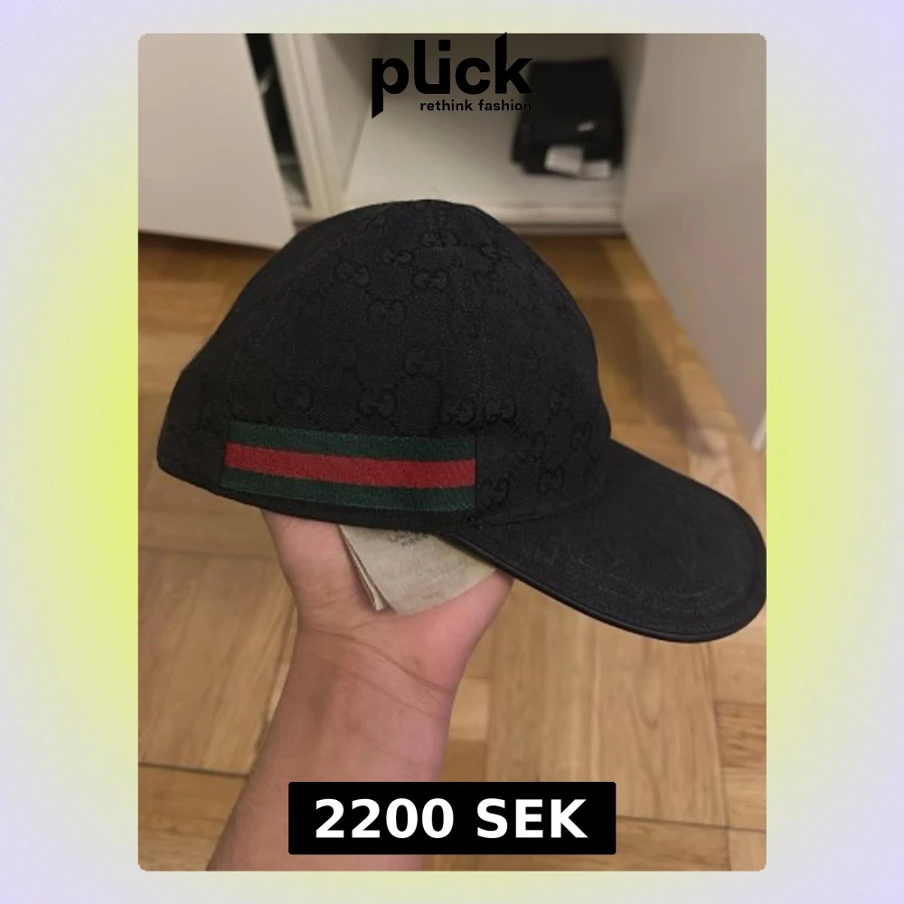 Säljer en svart keps från Gucci med det klassiska GG-monogrammönstret över hela kepsen. På sidan finns en grön och röd rand som är typisk för Gucci. Kepsen har böjd skärm och justerbar rem baktill. Materialet är tyg med exklusiv känsla.