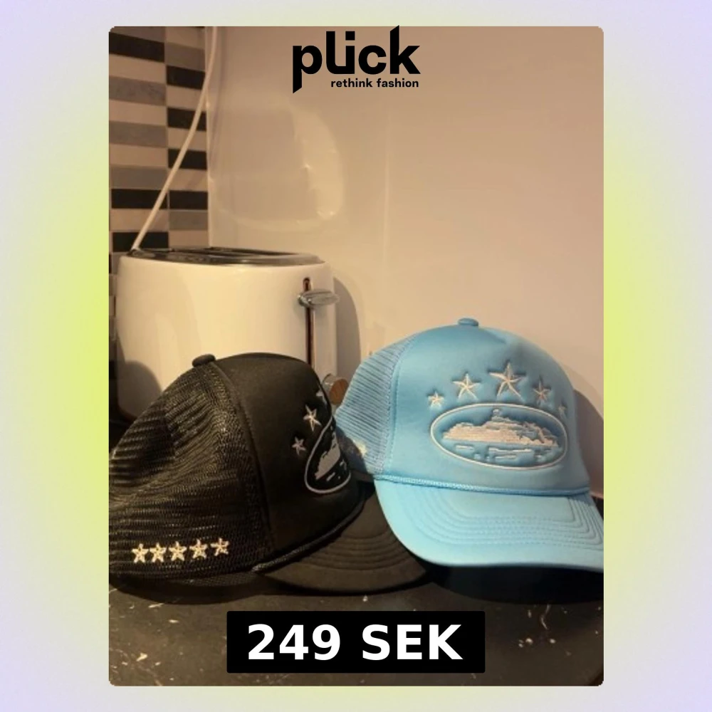 Två snygga truckerkepsar från Corteiz som passar alla skallar, en i svart och en i ljusblå. Båda har mesh på sidorna och broderade stjärnor samt logo på framsidan. Justerbar storlek baktill och broderad logga på sidan. Perfekt för dig som gillar streetwear och vill sticka ut. Givetvis Äkta köpta från CRTZ.RTW!