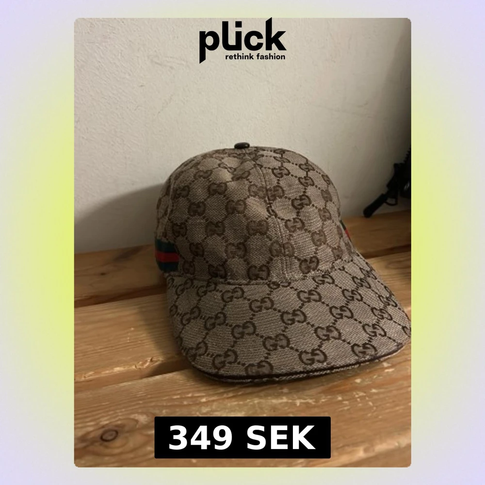 Säljer en beige keps från Gucci med det klassiska GG-monogrammönstret över hela kepsen. På sidan finns Guccis ikoniska gröna och röda rand. Kepsen är tillverkad i canvasmaterial och har böjd skärm. Perfekt för dig som vill ha en lyxig och trendig accessoar.