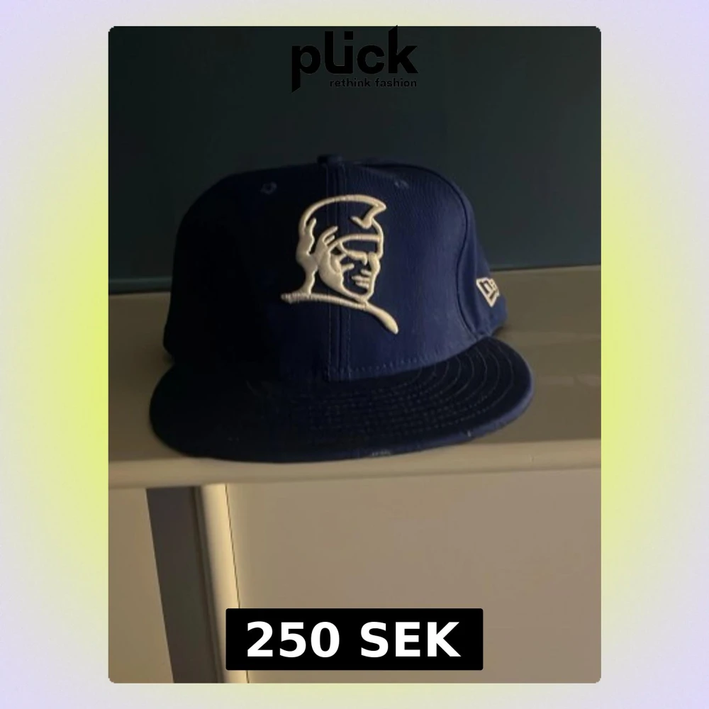 Säljer en blå keps från New Era med en broderad vit logga framtill som föreställer en hjälmprydd profil. Kepsen har rak skärm och klassisk snapback-form. Perfekt för dig som vill ha en stilren och sportig accessoar.