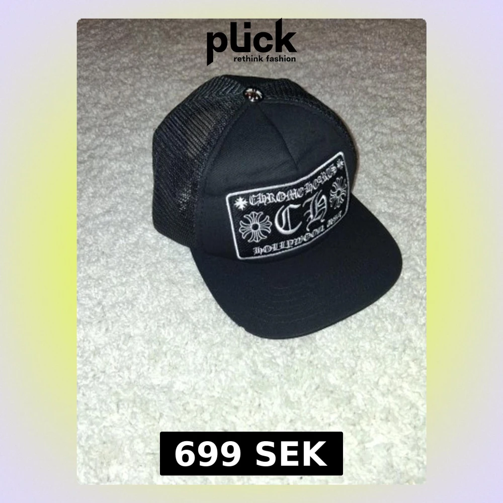 Säljer en svart truckerkeps från Chrome Hearts med vit brodyr framtill. Kepsen har mesh på sidorna och bak, samt en böjd skärm. På framsidan står det 'Chrome Hearts Hollywood USA' och har dekorativa korsdetaljer.