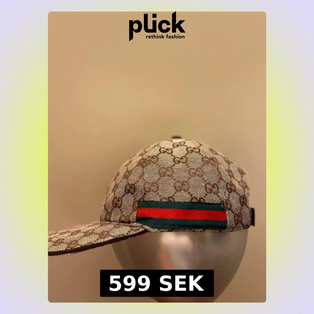 Säljer en beige keps med klassiskt GG-monogram över hela kepsen. På sidan finns en grön och röd rand som ger den en ikonisk touch. Kepsen har böjd skärm och justerbar rem bak. Materialet är canvasliknande och ger en lyxig känsla.