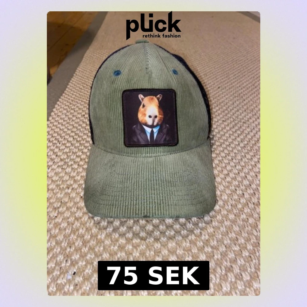 Säljer en olivgrön truckerkeps med svart mesh baktill och justerbart spänne. Framtill sitter en patch med en capybara i kostym. Kepsen är i manchestertyg framtill och har en unik, lekfull design.