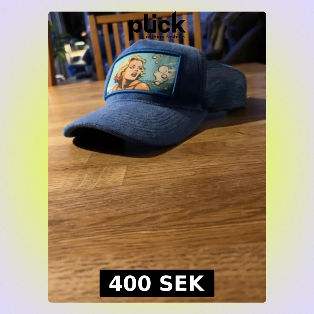 Säljer en blå keps med böjd skärm och mesh på sidorna. Framtill finns ett stort pop art-inspirerat tygmärke med motiv av en blond person och pratbubbla. Kepsen har justerbar baksida och cool streetstil från revenite. Den går inte att köpa online längre.