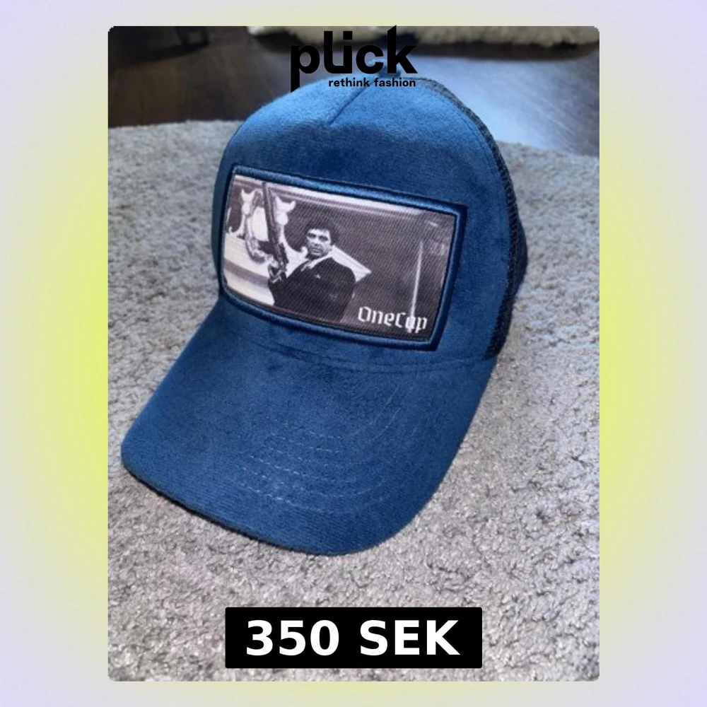 Snygg blå truckerkeps från OneCap med svart mesh på baksidan och ett stort tygmärke framtill med svartvit motiv. Kepsen har böjd skärm och justerbar snapback. Perfekt för dig som vill ha en unik och trendig accessoar.