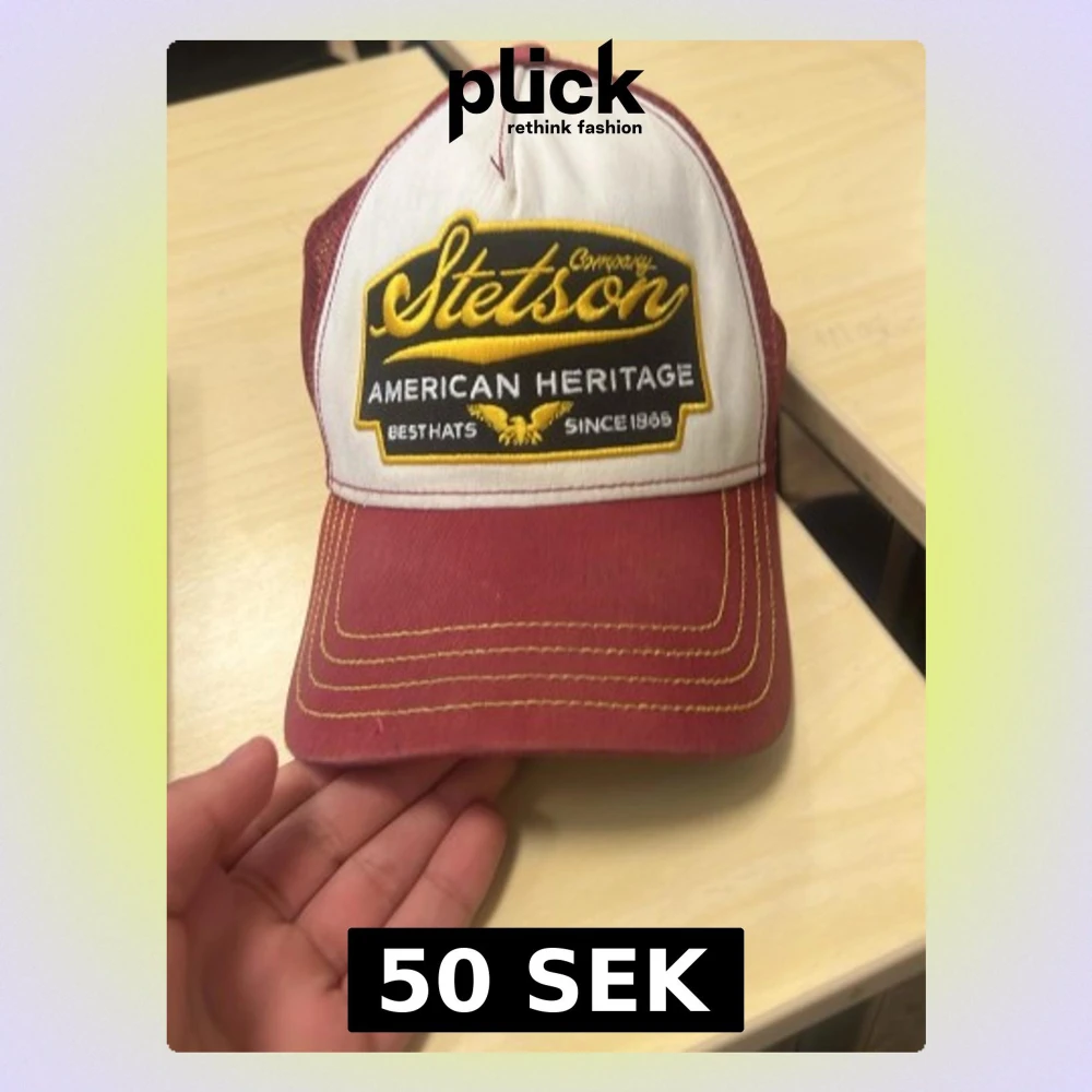 Säljer en snygg röd och vit keps från Stetson med broderad gul och svart patch framtill där det står 'Stetson American Heritage'. Kepsen har böjd skärm, mesh baktill och kontrastsömmar i gult. Perfekt för dig som gillar klassisk amerikansk stil.
