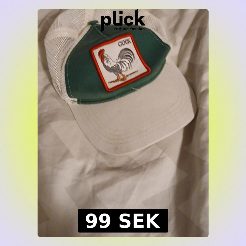 Säljer en grön och vit truckerkeps med mesh baktill och justerbart plastspänne. Framtill sitter ett patch med en tupp och texten 'COCK'. Perfekt för dig som vill sticka ut med en cool och retro keps.