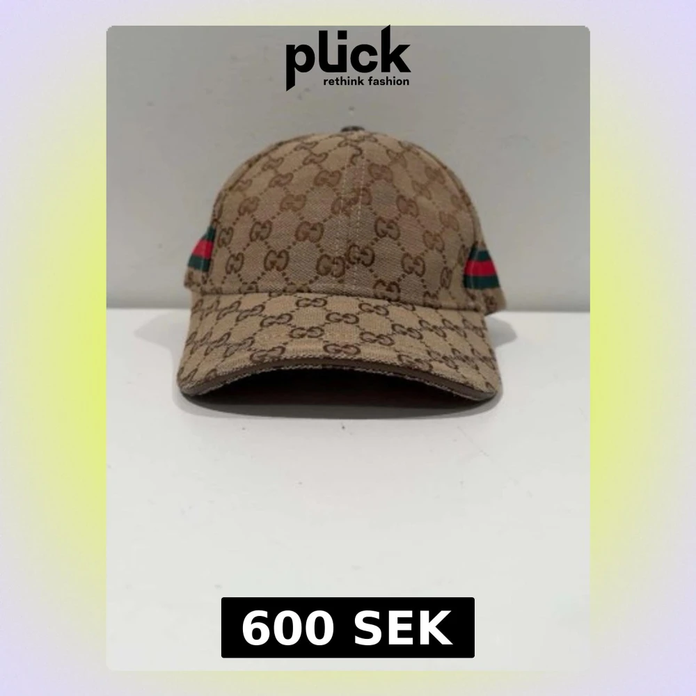 Säljer en beige keps från gg supreme med det klassiska GG-monogrammet över hela kepsen. På sidan finns en grön och röd rand som ger en ikonisk touch. Kepsen har böjd skärm och är tillverkad i canvasmaterial. Perfekt för dig som vill ha en stilren och lyxig accessoar.