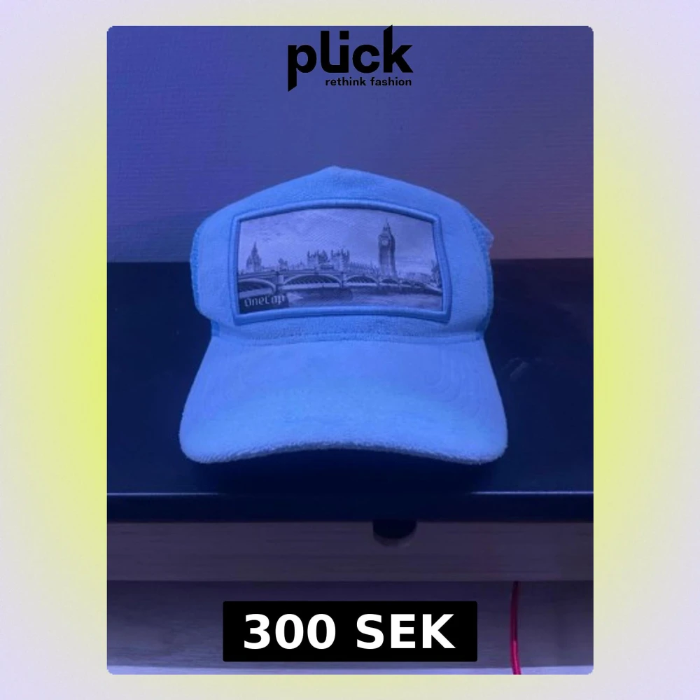 Snygg ljusblå keps från One Cap med mesh på sidorna och broderad patch framtill med Londonmotiv, inklusive Big Ben och Tower Bridge. Kepsen har böjd skärm och en liten metallbricka på sidan. Perfekt för dig som gillar streetstyle och unika accessoarer.