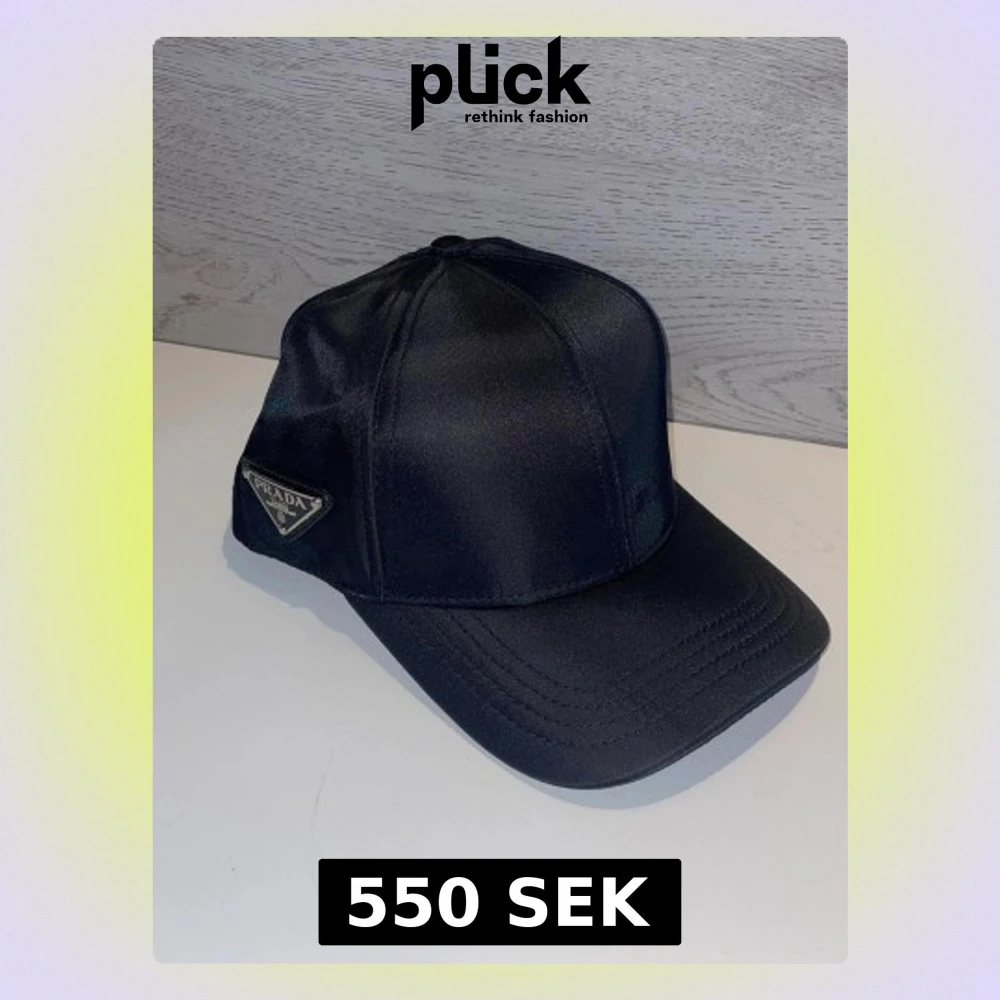 Snygg svart keps från Prada i glansigt nylonmaterial med klassisk böjd skärm och ikonisk metallogo på sidan. Perfekt accessoar för en trendig och sportig look. Justerbar baktill för bästa passform.