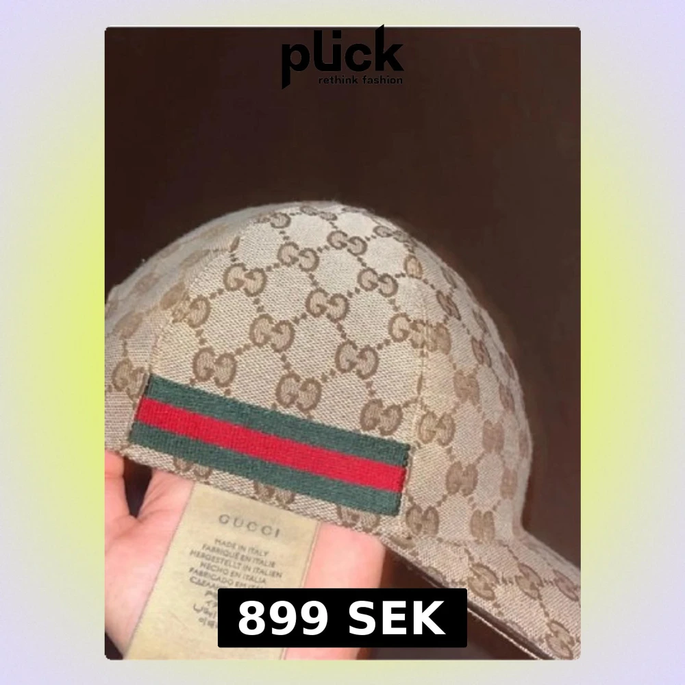 Säljer en beige keps med det klassiska GG Supreme-mönstret i brunt över hela kepsen. På sidan finns den ikoniska gröna och röda randen. Kepsen är tillverkad i canvasmaterial och har böjd skärm. Perfekt för dig som vill ha en lyxig och trendig accessoar.