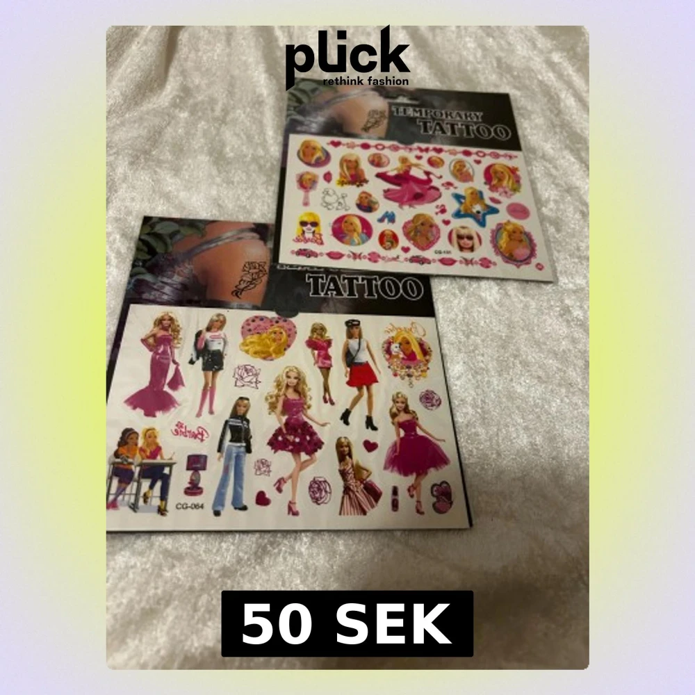 Två ark med temporära tatueringar med Barbie-tema. Motiven inkluderar Barbie-figurer i olika outfits, rosa klänningar, accessoarer, stjärnor, hjärtan och rosor. Färgerna är främst rosa, lila och gult. Perfekt för att dekorera huden med roliga och färgglada Barbie-bilder.