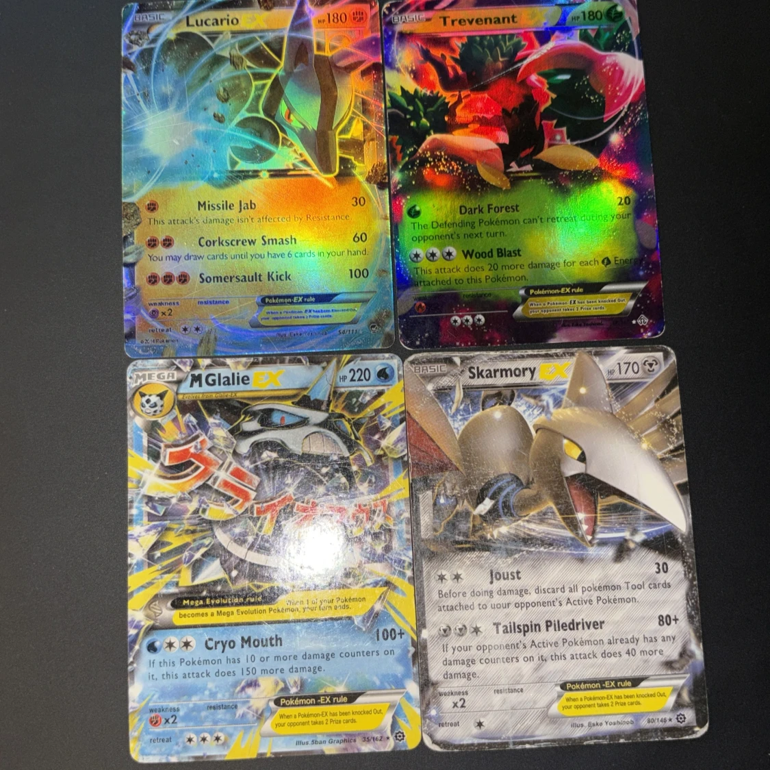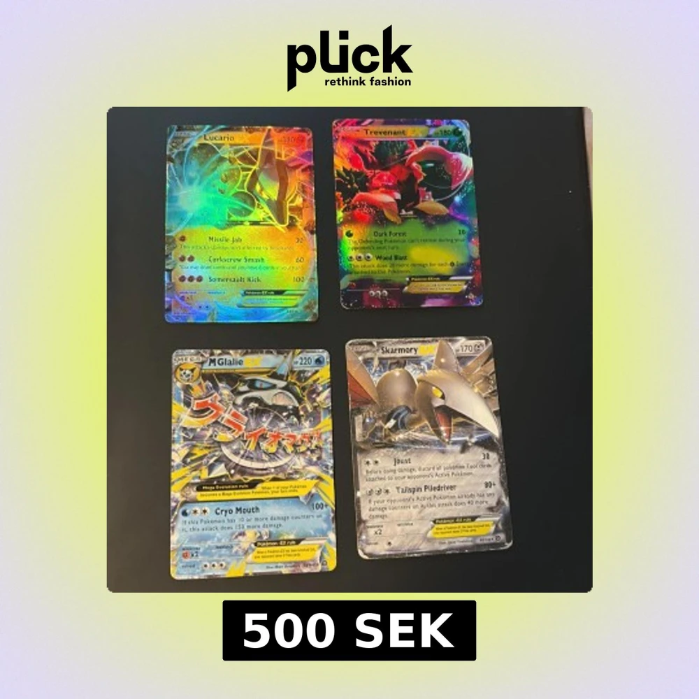 Fet samling med fyra glittrande Pokémon EX-kort: Lucario, Trevenant, Mega Glalie och Skarmory! Perfekt för dig som vill boosta din samling eller spela med riktigt coola och kraftfulla kort. De 2 längst upp har snygg holo-effekt och alla är i fint skick.