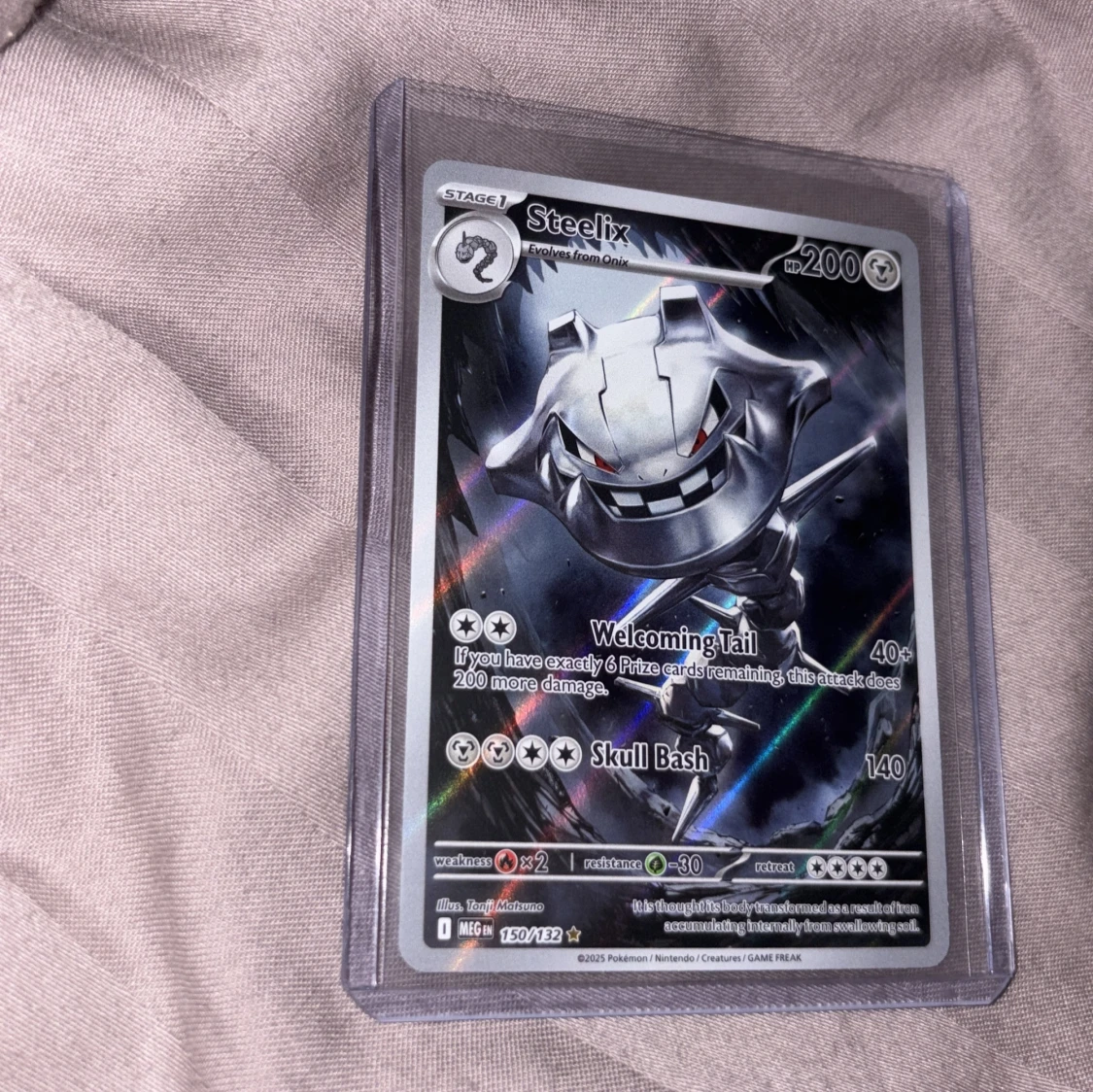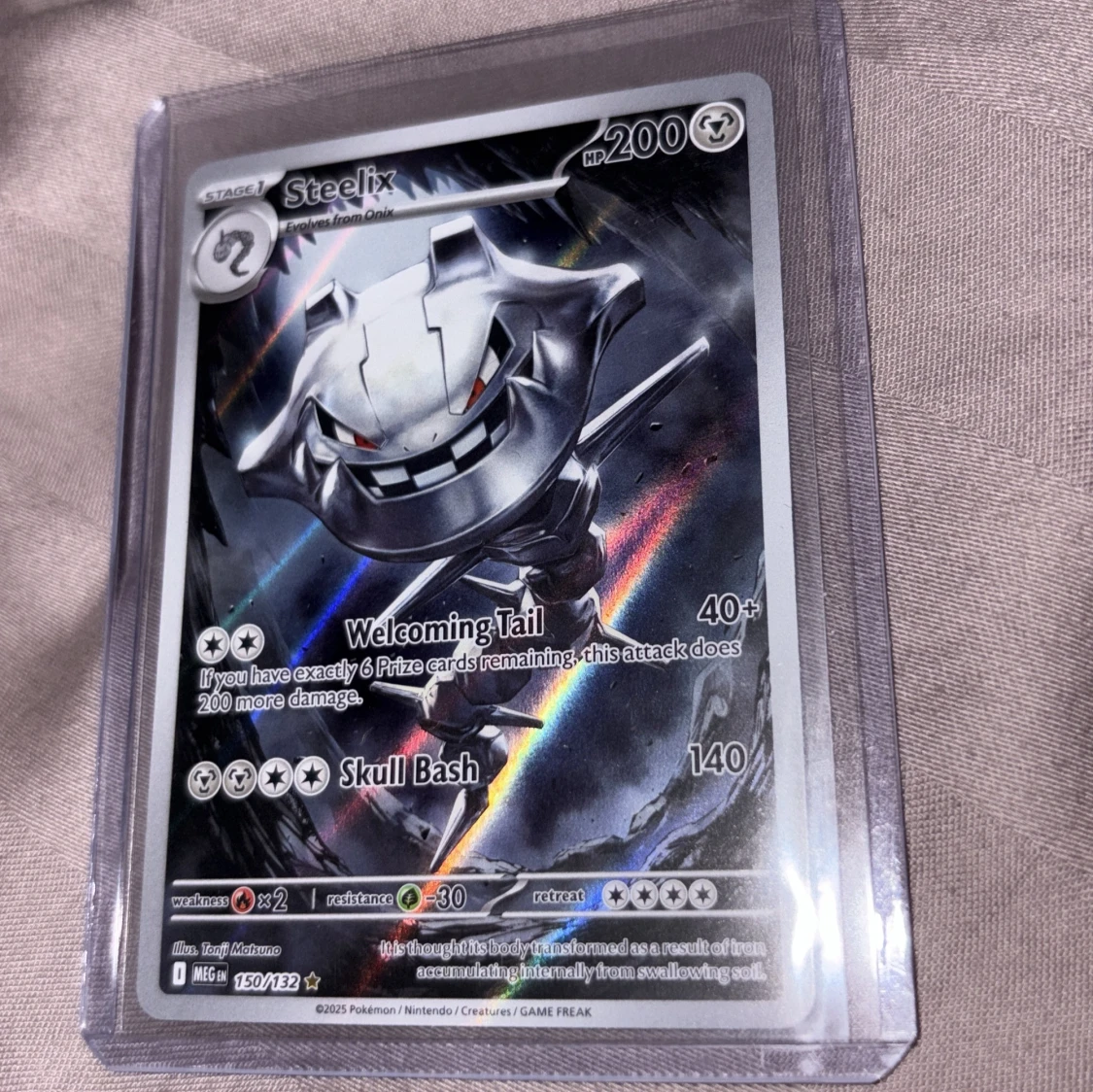 Steelix är en cool och kraftfull Pokémon-kort med 200 HP och attacker som Welcoming Tail och Skull Bash. Perfekt för dig som samlar eller spelar Pokémon och vill ha ett glänsande och sällsynt kort i din samling!