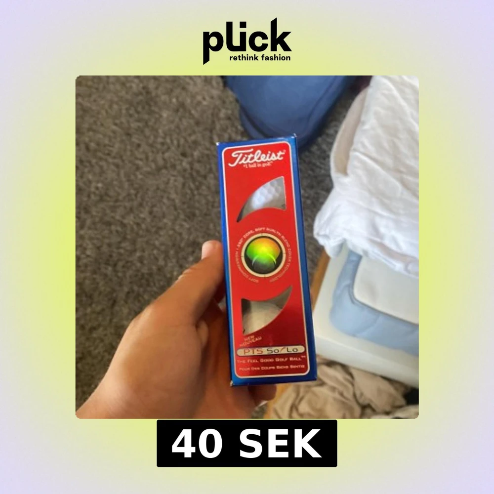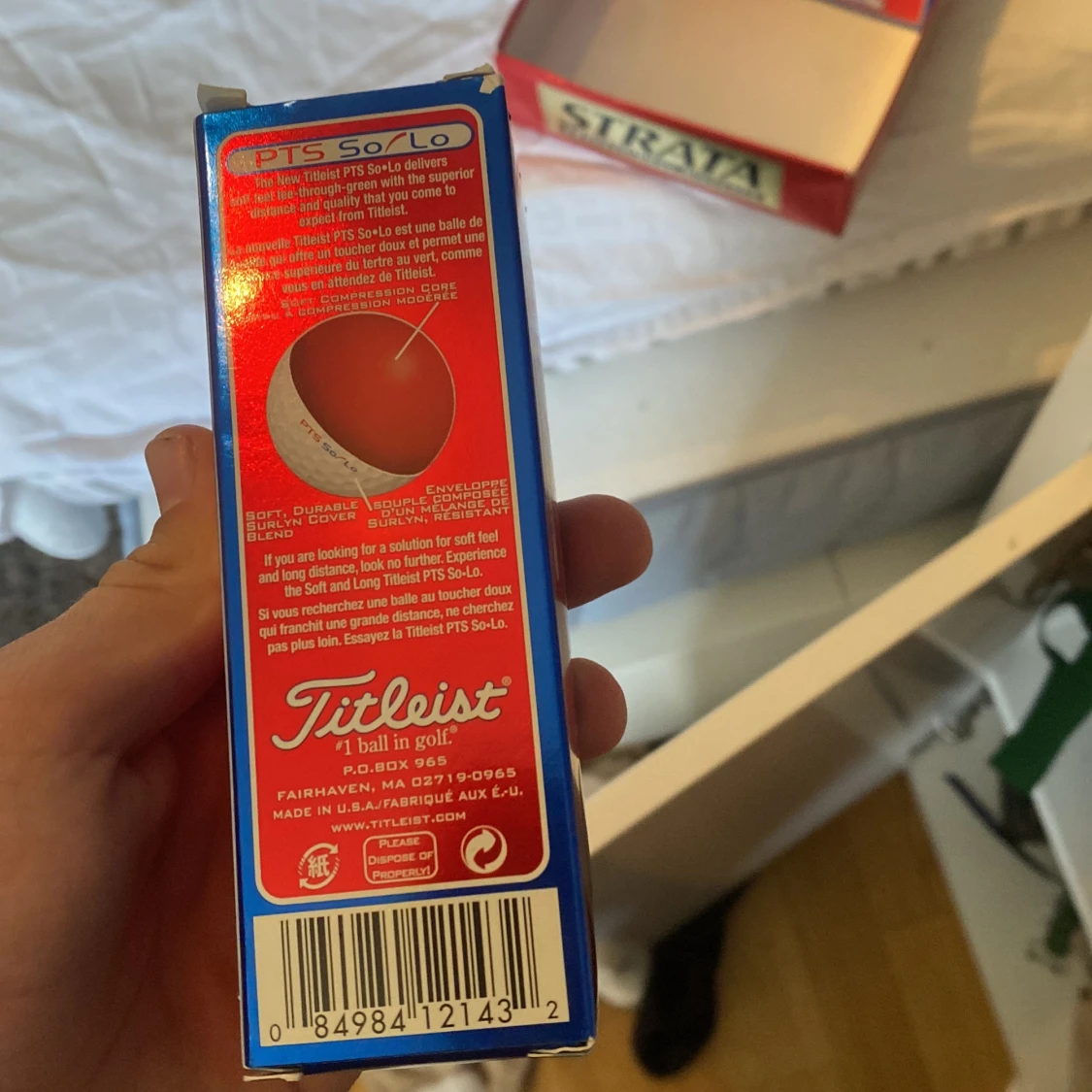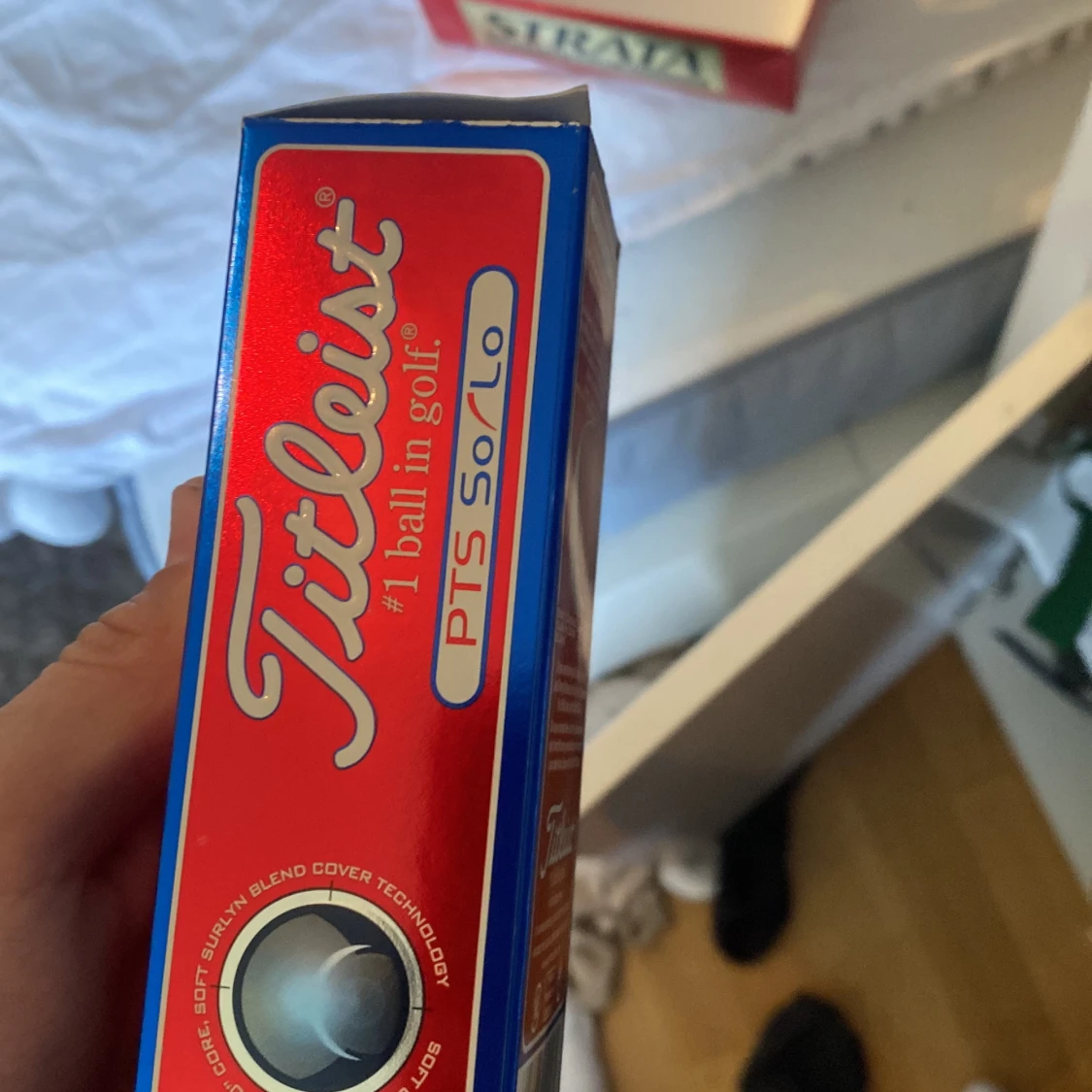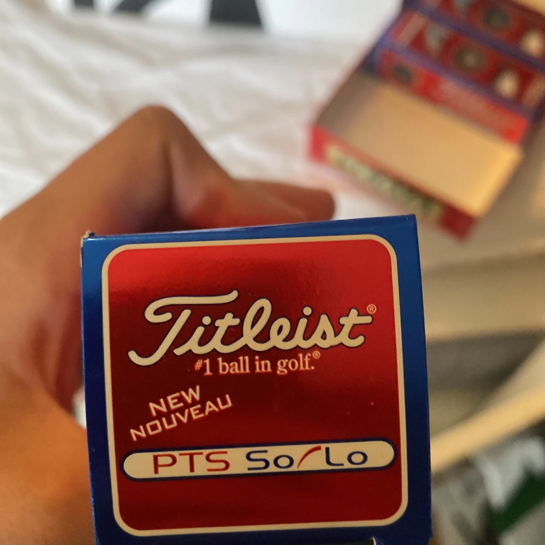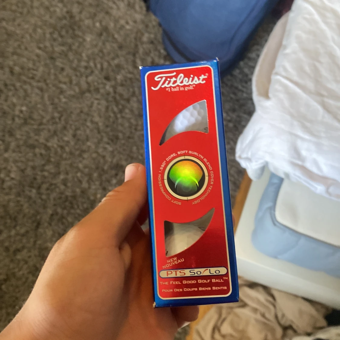 Säljer en förpackning Titleist PTS So/Lo golfbollar. Förpackningen är blå och röd med vita detaljer och innehåller bollar med soft surlyn blend cover technology. Perfekt för golfentusiasten som vill ha hög kvalitet på sina bollar.