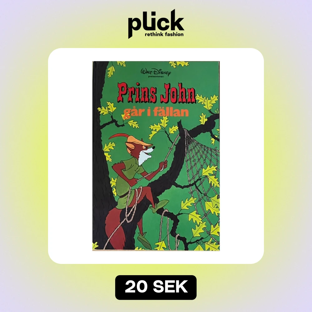En bok från Walt Disney med titeln 'Prins John går i fällan'. Omslaget visar en räv i grön klädsel som klättrar i ett träd med gröna löv och ett nät. Texten är i röd och orange färg på en grön bakgrund.