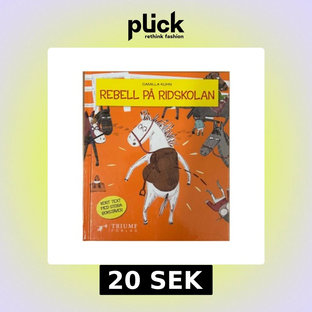 En färgglad och rolig bok med kort text och stora bokstäver, perfekt för unga läsare. Omslaget är orange med illustrationer av hästar i olika situationer, vilket ger en humoristisk känsla.