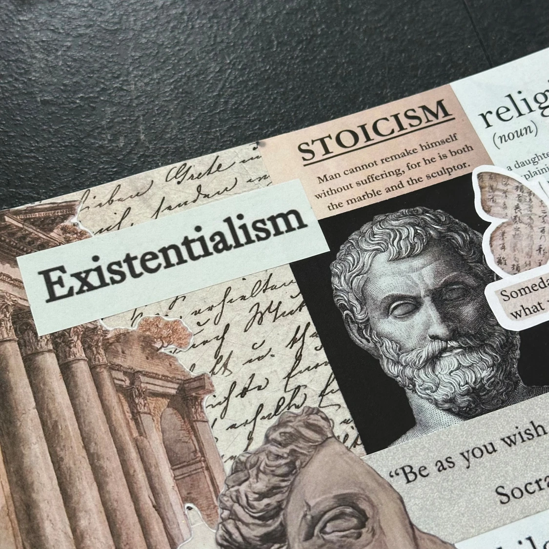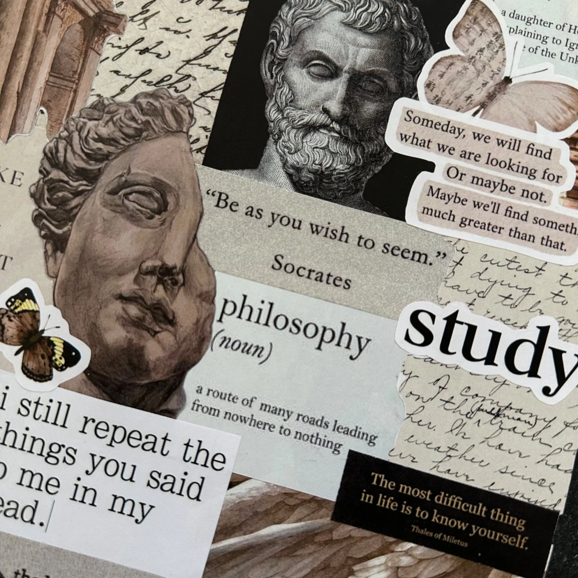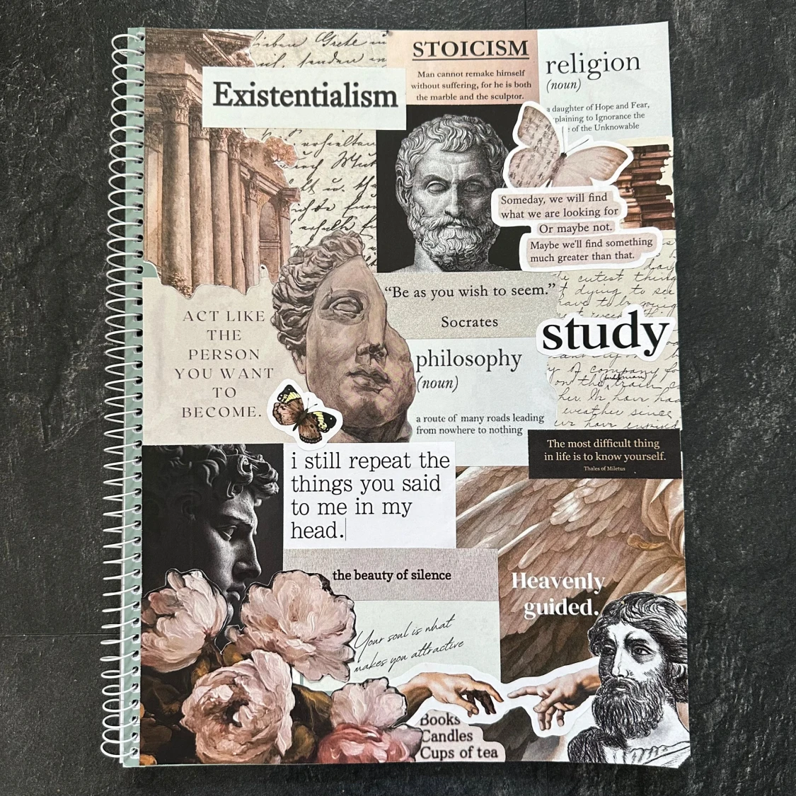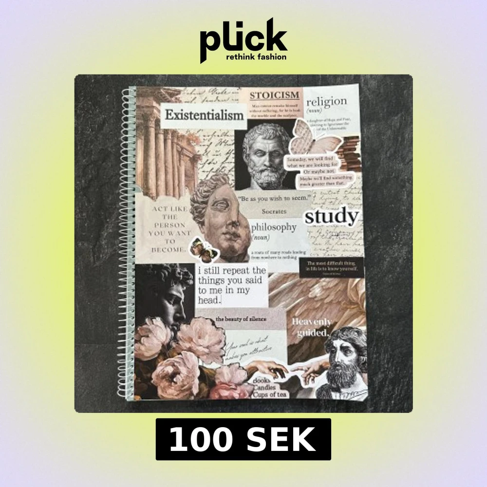 En spiralbunden anteckningsbok med collage av citat och motiv om filosofi. Perfekt för dig som gillar att reflektera, skriva ner tankar eller plugga filosofi. Inspirerande omslag med klassiska motiv, blommor och tänkvärda ord. Passar unga vuxna och studenter! Kan även designa anteckningsböcker med andra teman för andra ämnen!
