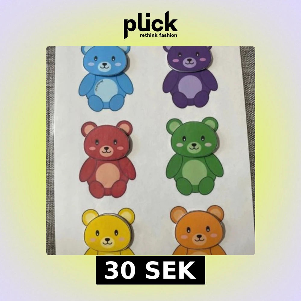 Säljer ett set med färgglada björnar i olika färger som används för färgmatchning och lek. Björnarna är gjorda av papper och har kardborre på baksidan för att enkelt kunna fästas och tas loss. Perfekt för att lära sig färger och utveckla finmotorik.