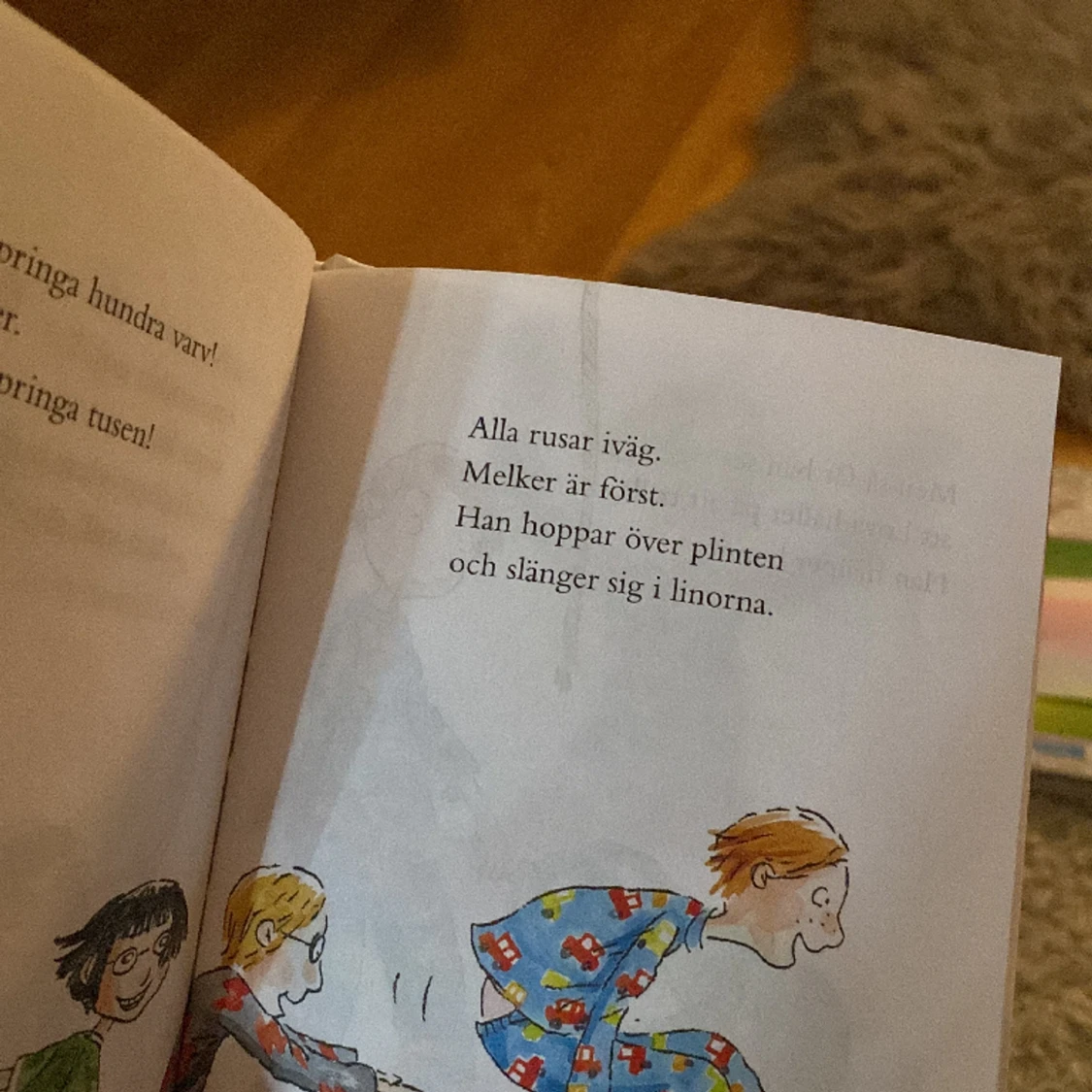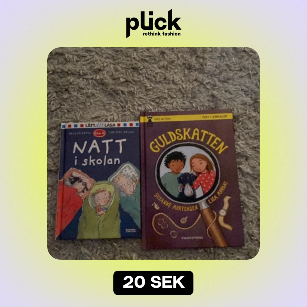 Natt i skolan och Guldskatten Har cirka 3 till 5 meningar per sida . Det är 2 tunna böcker för lite mindre barn. Använda cirka 1 gång. Det kostar 20 kr styck . Vid intresse,hör av dig 👍tar Swish
