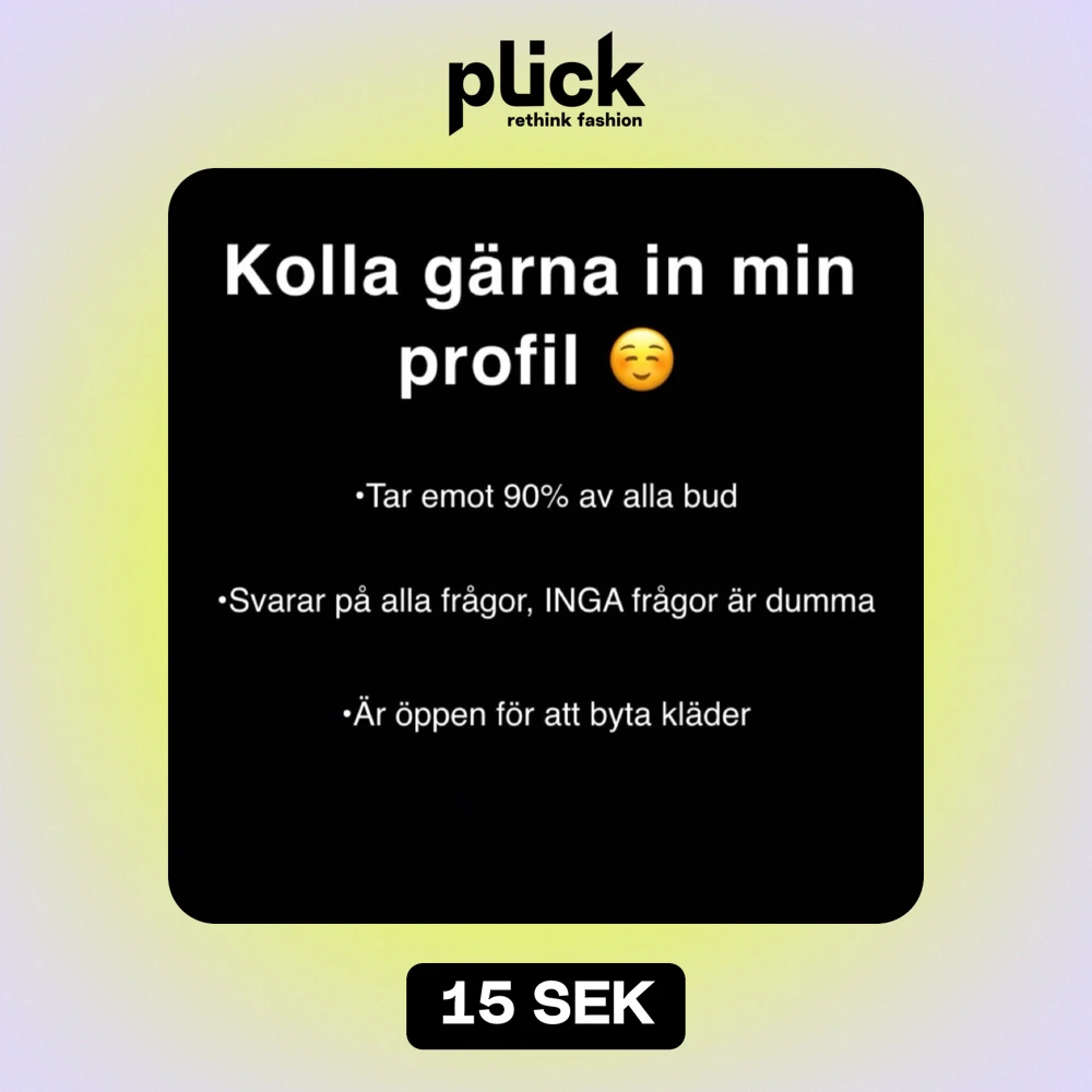 Bilden innehåller text som uppmanar att kolla in en profil för klädbyten och budgivning.