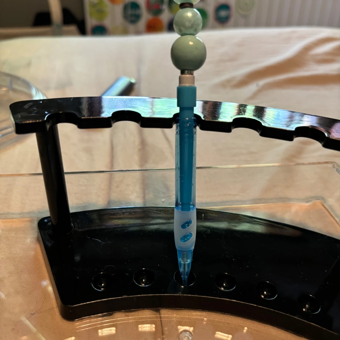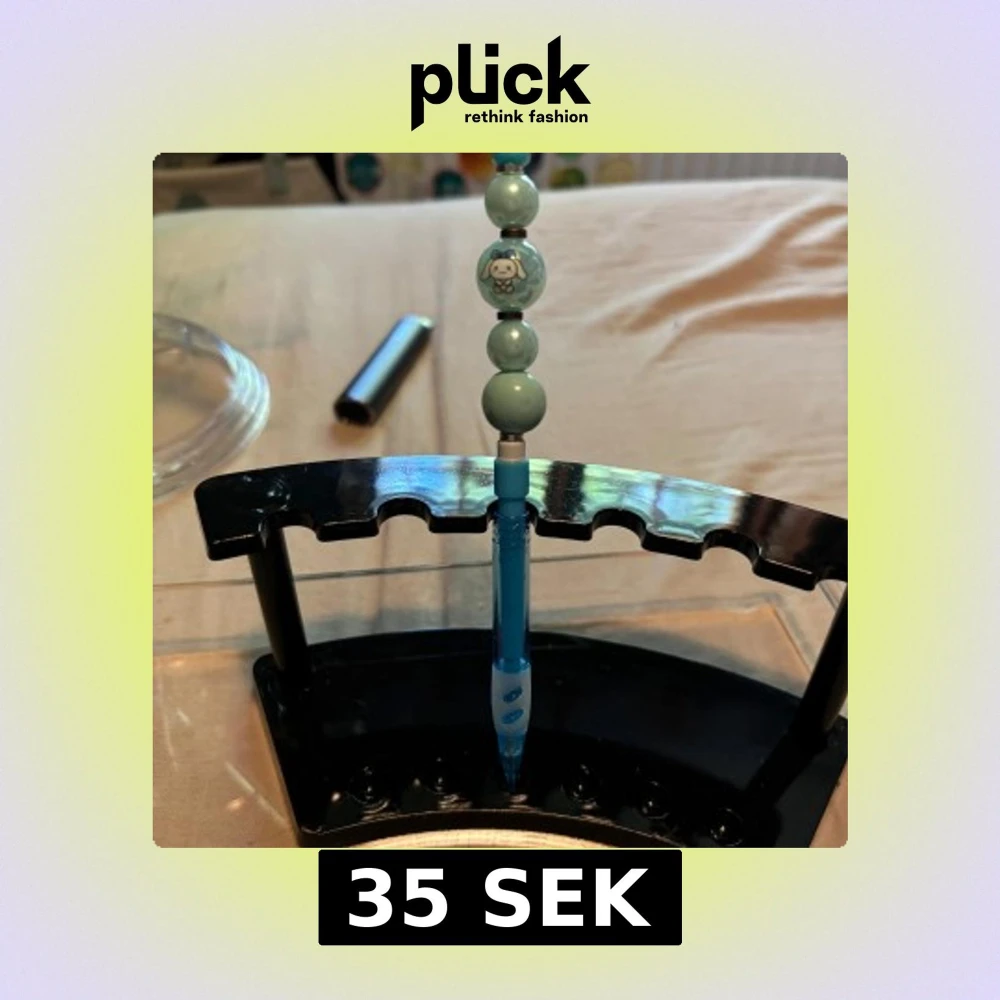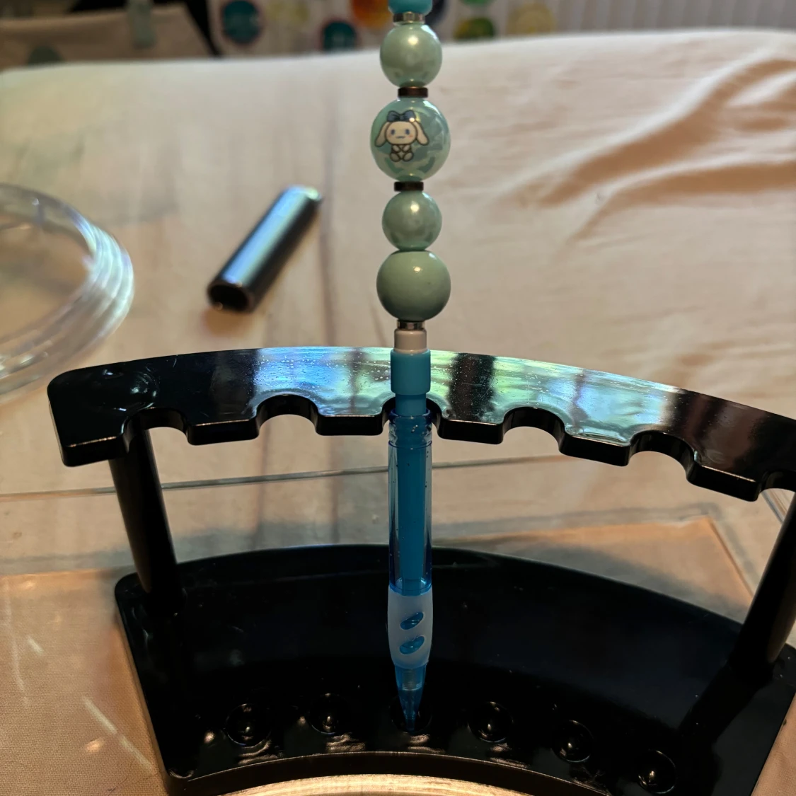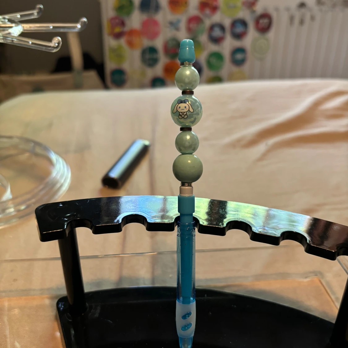 Bilderna visar en blå penna dekorerad med pärlor, inklusive en med en söt hundfigur. Pennan står i ett svart ställ.