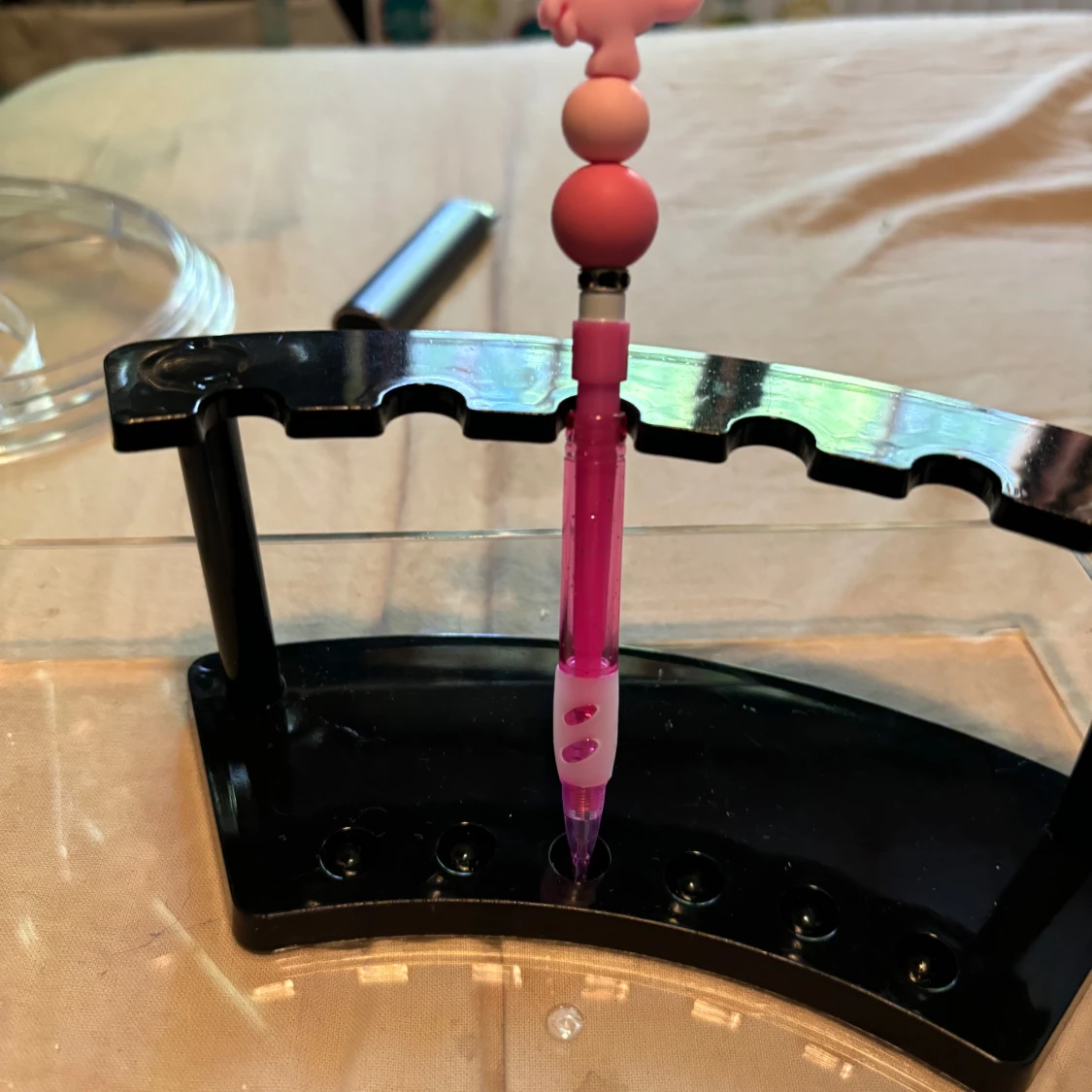 Bilderna visar en rosa penna med ett sött dinosaurie- och pärldekor på toppen, placerad i ett svart pennställ.