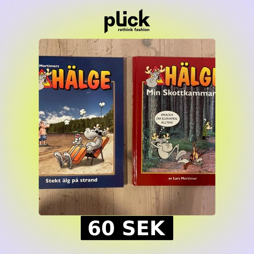 Två humoristiska serieböcker av Lars Mortimer med älgen Hälge i huvudrollen. 'Stekt älg på strand' har ett blått omslag och 'Min Skottkammare' har ett rött omslag. Perfekt för den som gillar skämt och serier om skogen och jakt. Mycket fina välbehållna nästintill oanvända inbundna böcker.
