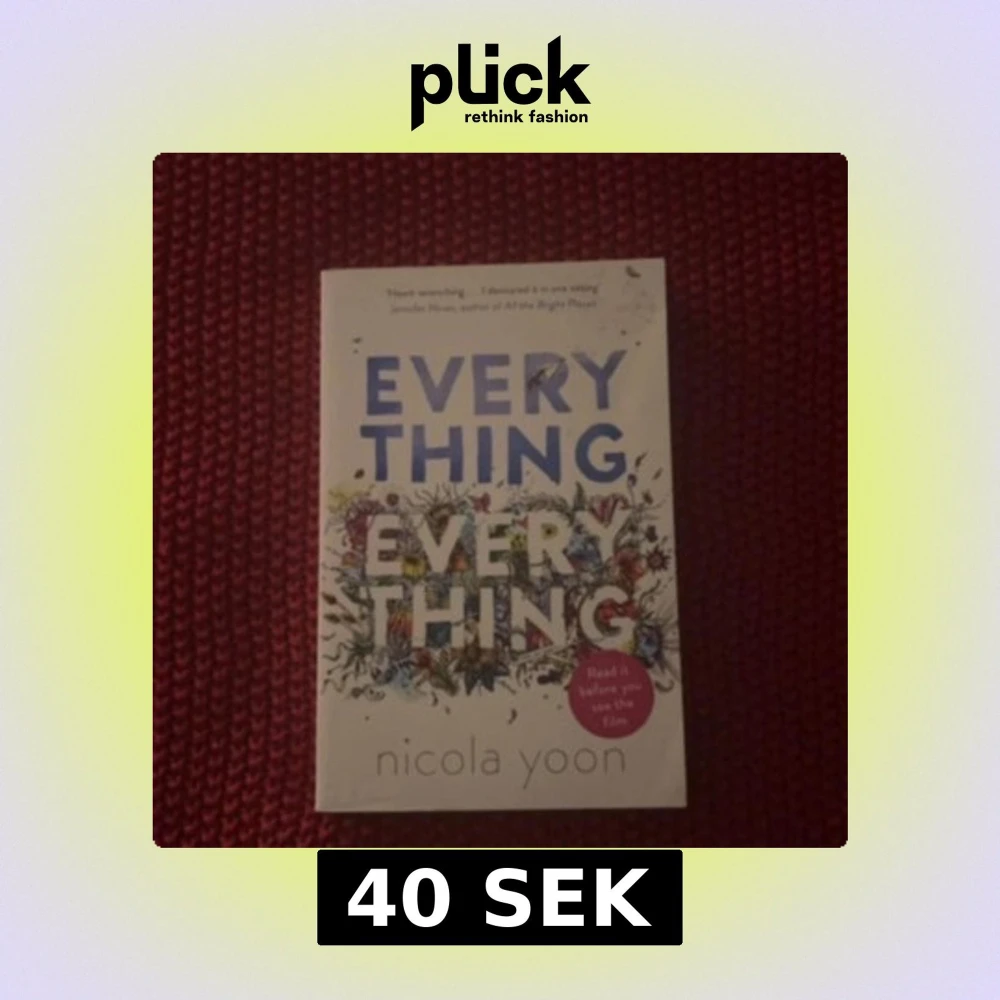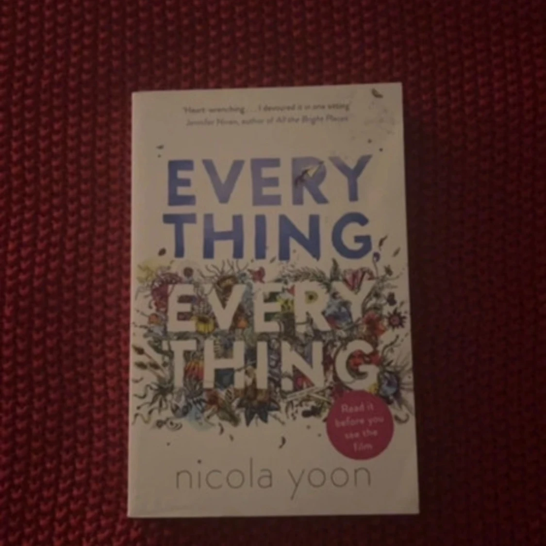 Boken 'Everything, Everything' av Nicola Yoon handlar om en tjej som lever isolerat på grund av en sjukdom. Omslaget är vitt med titeln i stora blå och svarta bokstäver, dekorerat med blommor och växter. En röd cirkel på framsidan nämner att boken har filmatiserats.