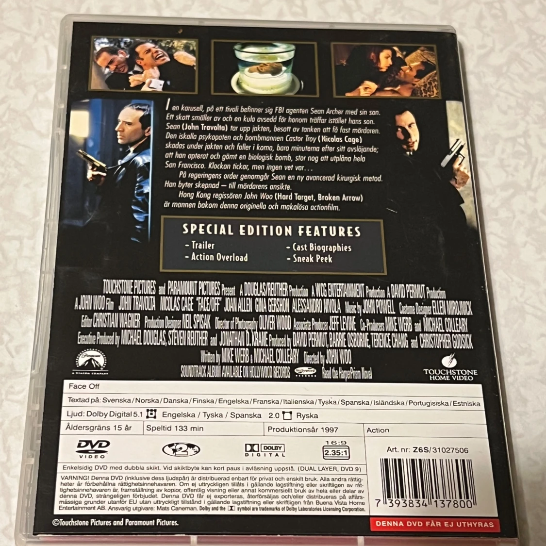 Säljer en specialutgåva av filmen Face/Off på DVD. Denna utgåva innehåller bonusmaterial som trailers, action overload och skådespelarbiografier. Omslaget har en dramatisk design med bilder av huvudkaraktärerna. Perfekt för filmälskare som gillar action och spänning!säljs för 50