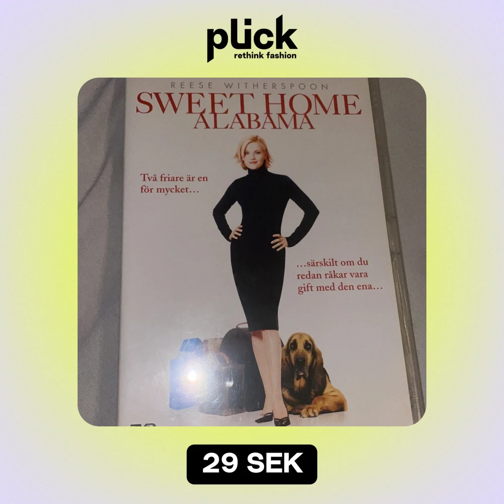 Säljer en DVD av filmen 'Sweet Home Alabama' med Reese Witherspoon. Det är en romantisk komedi om Melanie som återvänder till Alabama för att ordna upp sitt liv. Inkluderar specialfunktioner som audio commentary och borttagna scener. Perfekt för en filmkväll!