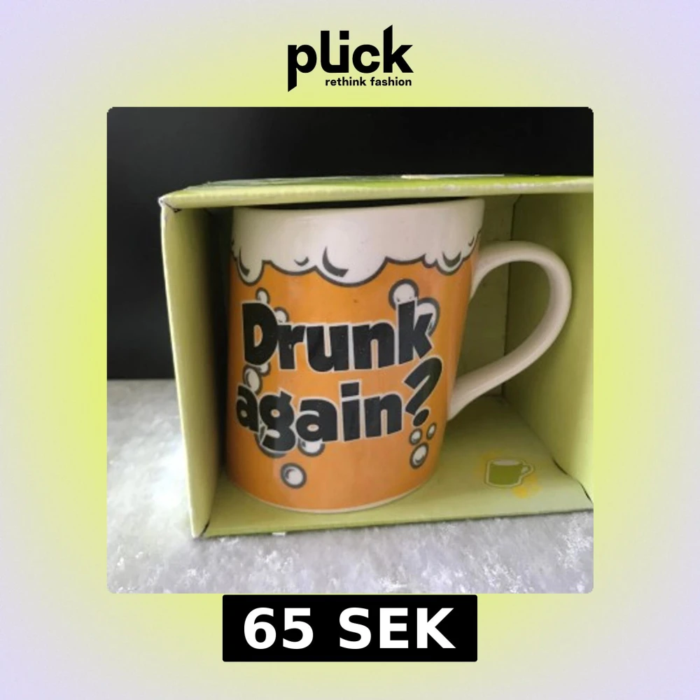 Rolig mugg i vitt och orange med texten 'Drunk again?' och bubblor som dekoration. Muggen levereras i originalförpackning med grönt mönster och illustrationer av olika muggar. Perfekt som present eller till samlingen.
