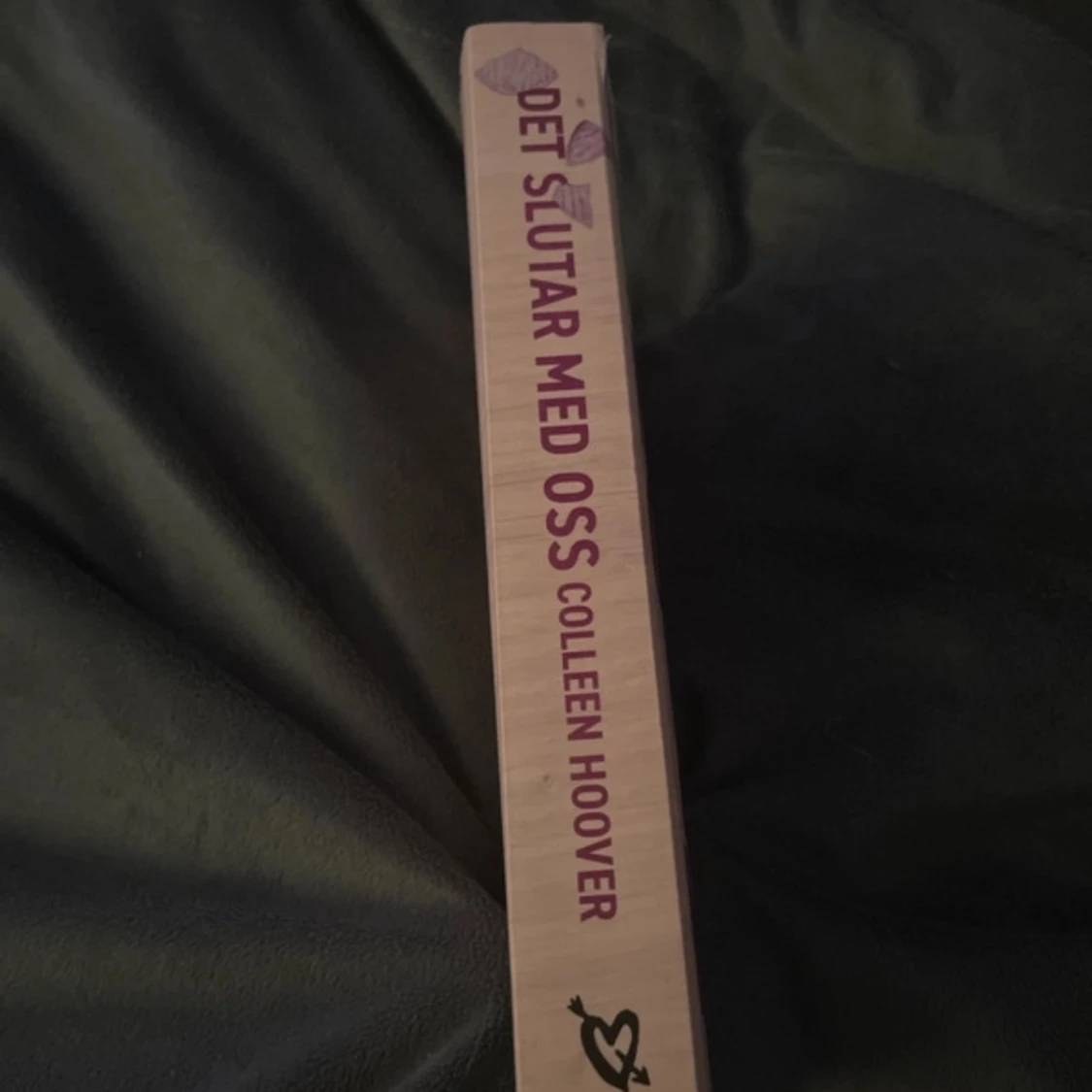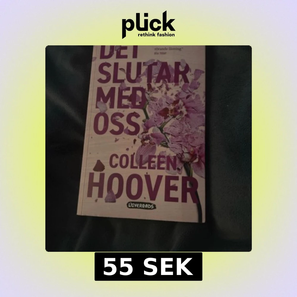 Säljer boken 'Det slutar med oss' av Colleen Hoover, utgiven av Lovereads. Omslaget är beige med lila text och blommotiv. Boken är en roman om kärlek, relationer och svåra val, och är en New York Times bästsäljare.