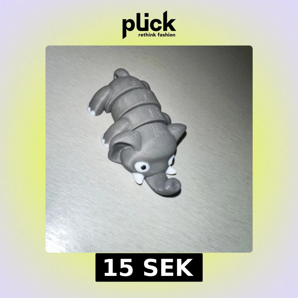 Charmig grå elefantfigur skapad med 3D-printing. Den har en segmenterad kropp som ger den en flexibel och lekfull design. Perfekt som dekoration eller leksak.
