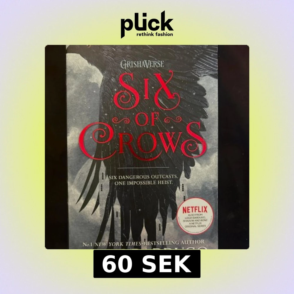 Säljer boken 'Six of Crows' från Grishaverse-serien. Omslaget är svart och grått med röda detaljer och motiv av en kråka. Boken är på engelska och är första delen i en duologi. Perfekt för dig som gillar fantasy, äventyr och spänning.