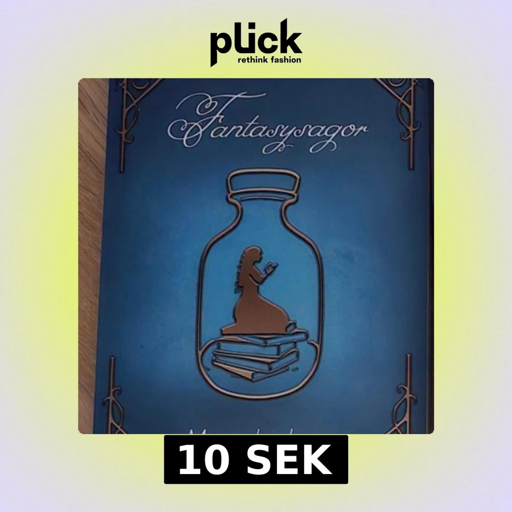 En vackert designad bok med titeln 'Fantasysagor'. Omslaget är i en djup blå färg med dekorativa hörn och en silhuett av en flicka som sitter på en hög med böcker inuti en flaska. Perfekt för fantasyälskare som vill försvinna in i magiska berättelser.