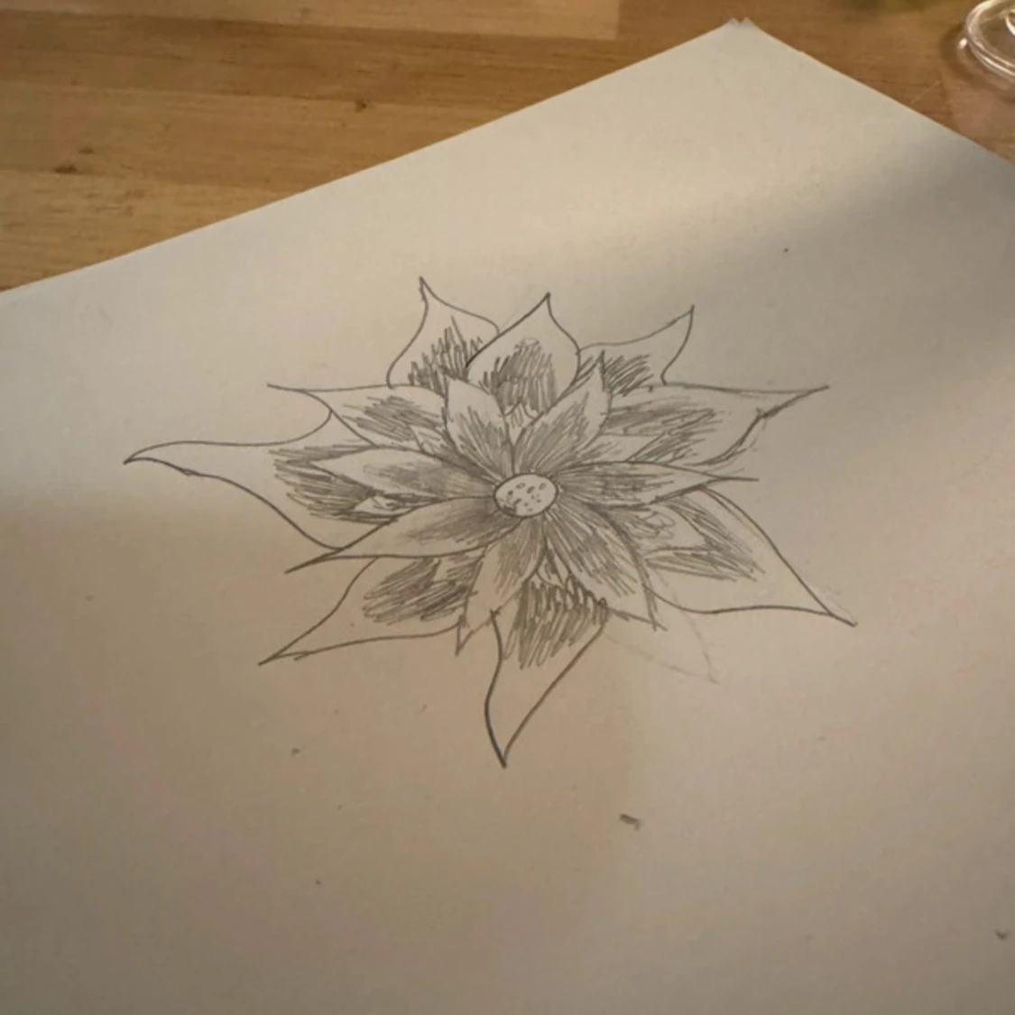 En detaljerad blyertsteckning av en blomma med flera lager av kronblad. Blomman har en tydlig mitt och omgivande blad som ger en tredimensionell effekt. Perfekt för konstälskare eller som inspiration för egna teckningar.