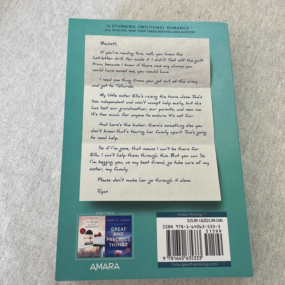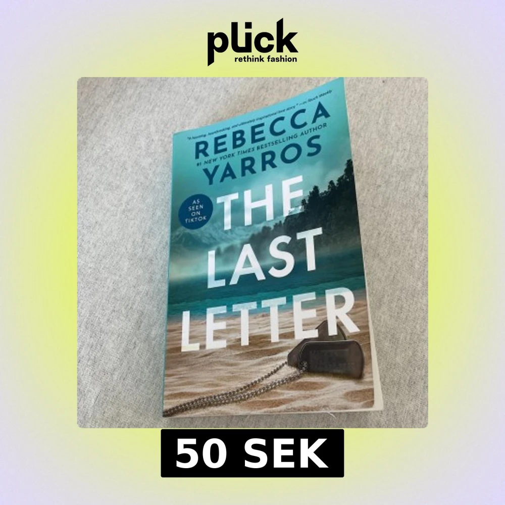Boken 'The Last Letter' av Rebecca Yarros är en känslosam roman som har fått uppmärksamhet på TikTok. Omslaget visar en dramatisk kustlinje med havsvågor och en hundtagg i förgrunden. Perfekt för dig som gillar gripande berättelser.