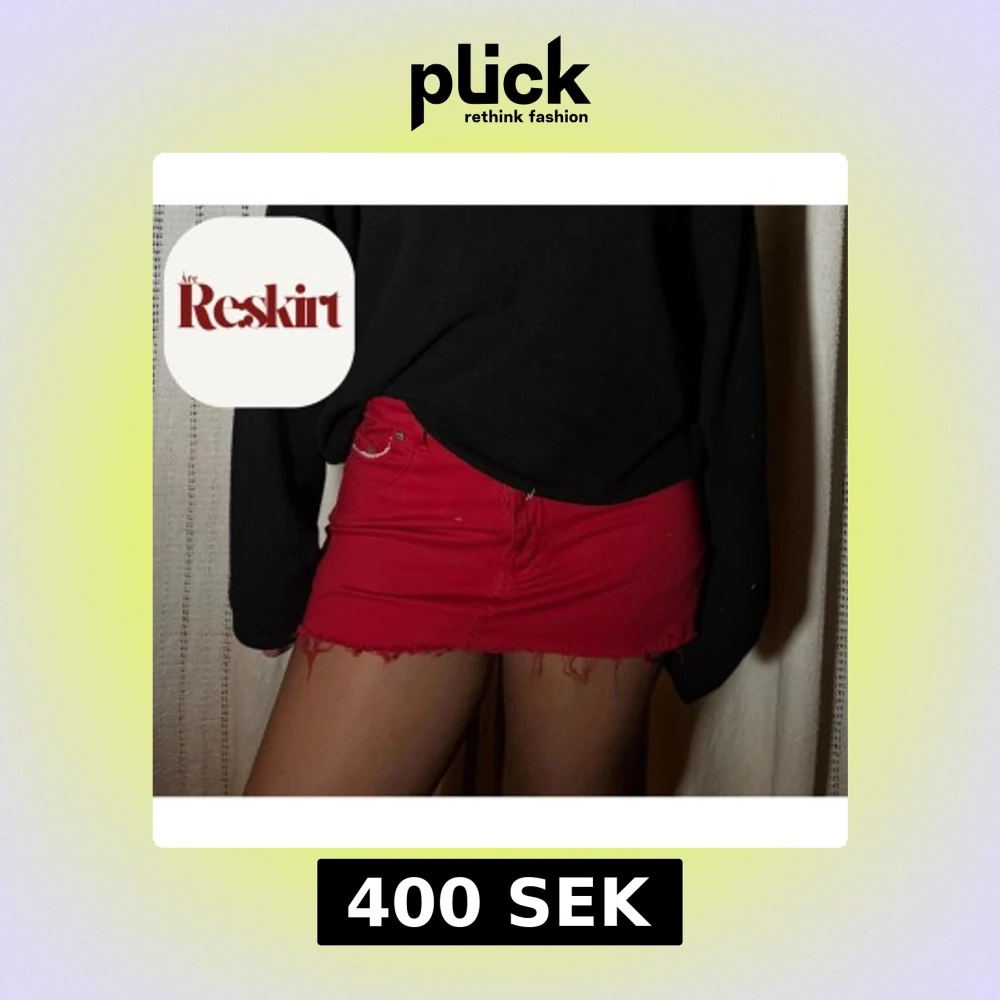 Röd jeanskjol. Midja: 40 cm. Stuss: 32 cm. Gren: 26 cm.