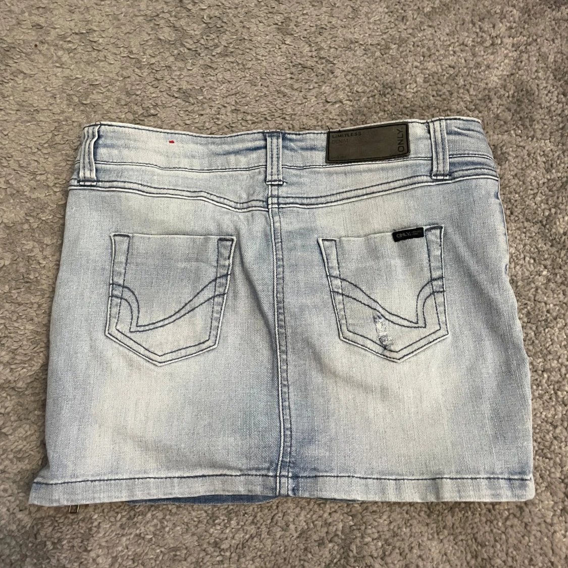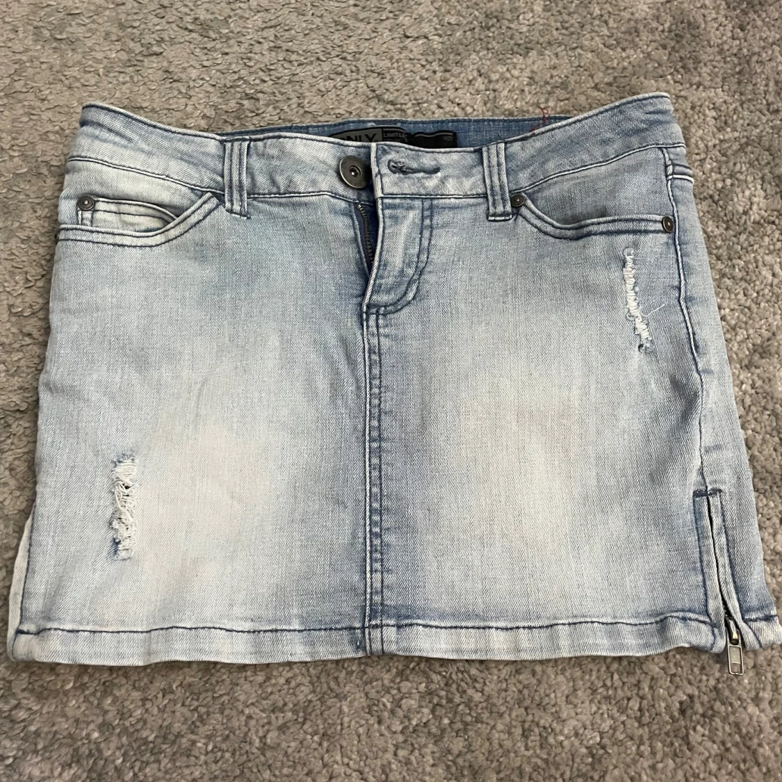 Ljusblå jeanskjol från ONLY med slitna detaljer, klassiska fickor både fram och bak samt dragkedja i sidan. Kjolen har bälteshällor och en snygg, kort passform.