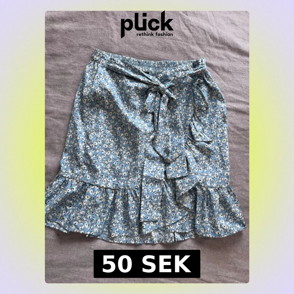 Söt kort omlottkjol i ljusblått med små vita blommor och volangkant. Kjolen har knyt i midjan och elastisk resår för skön passform. Perfekt för vår och sommar när du vill ha en lätt och luftig look.