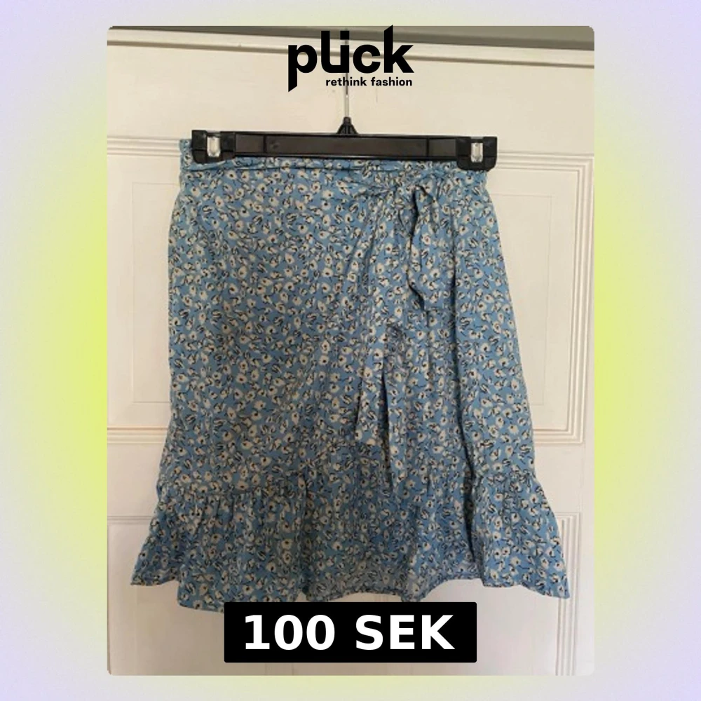 Söt blå omlottkjol med blommigt mönster och volangkant. Kjolen har knytband i midjan och är perfekt för varma dagar. Lätt och luftig modell som ger en avslappnad och trendig look.