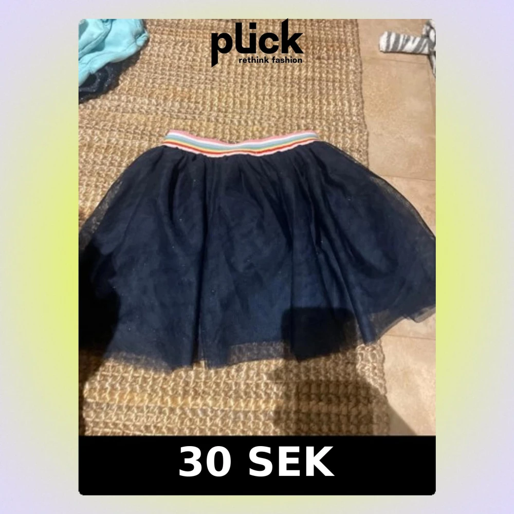 BARN storlek Säljer en svart kortkjol i tyll med elastisk midja som har färgglada ränder i vitt, rosa och orange. Kjolen har en voluminös look och passar perfekt för dig som vill ha en lekfull och trendig stil.