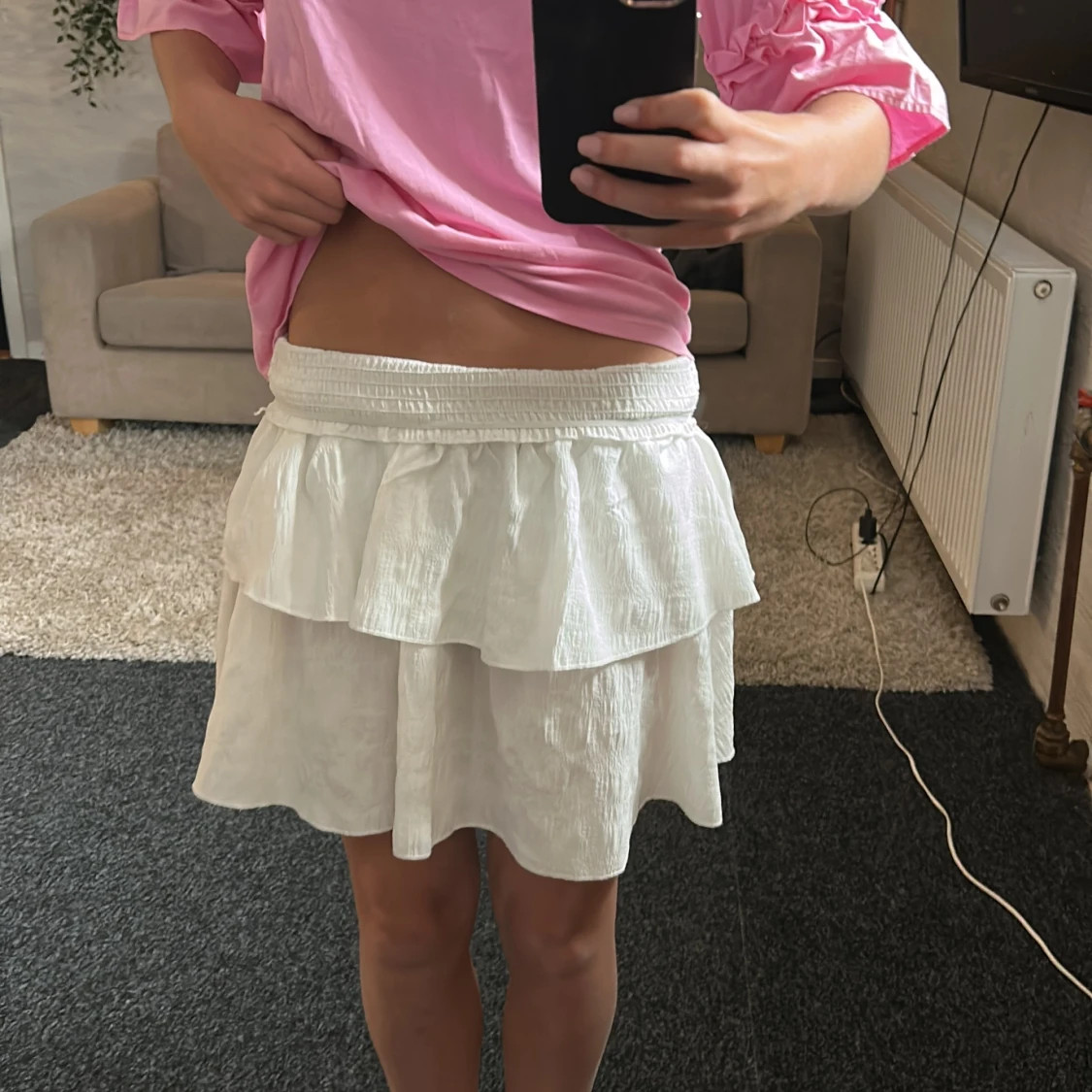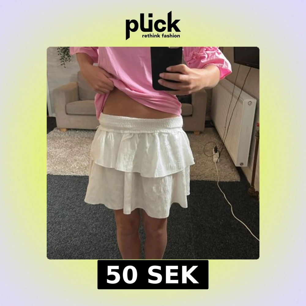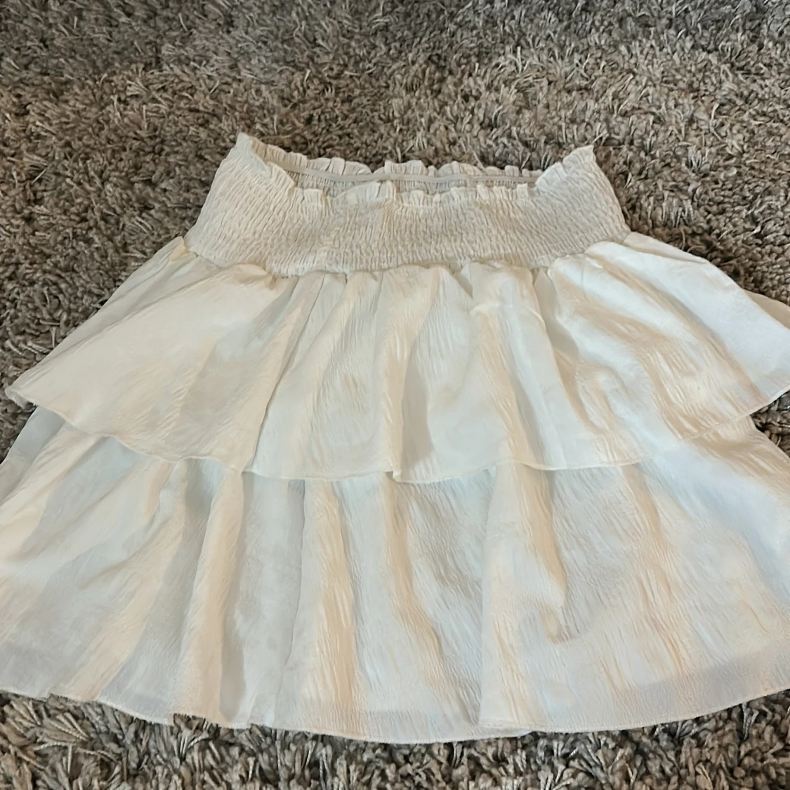 Superfin vit kortkjol med dubbla volanger och bred resår i midjan. Kjolen är lätt och luftig, perfekt för varma dagar. Materialet känns som bomull eller linne och ger en skön vibe. Enkel att matcha med både t-shirt och crop top.