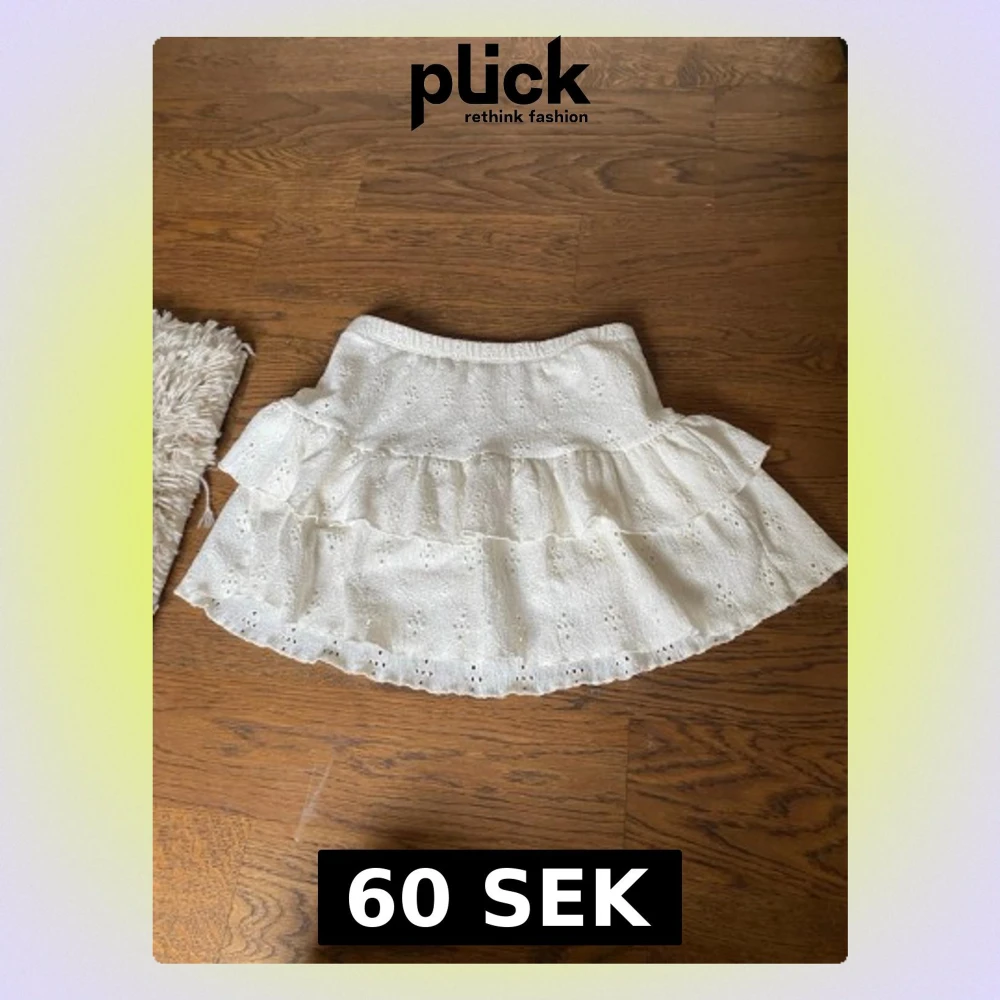 Söt vit kortkjol med volanger och broderade hålmönster. Kjolen har elastisk midja och är perfekt för varma dagar. Den romantiska stilen och de fina detaljerna gör den superfin till både sneakers och sandaler.